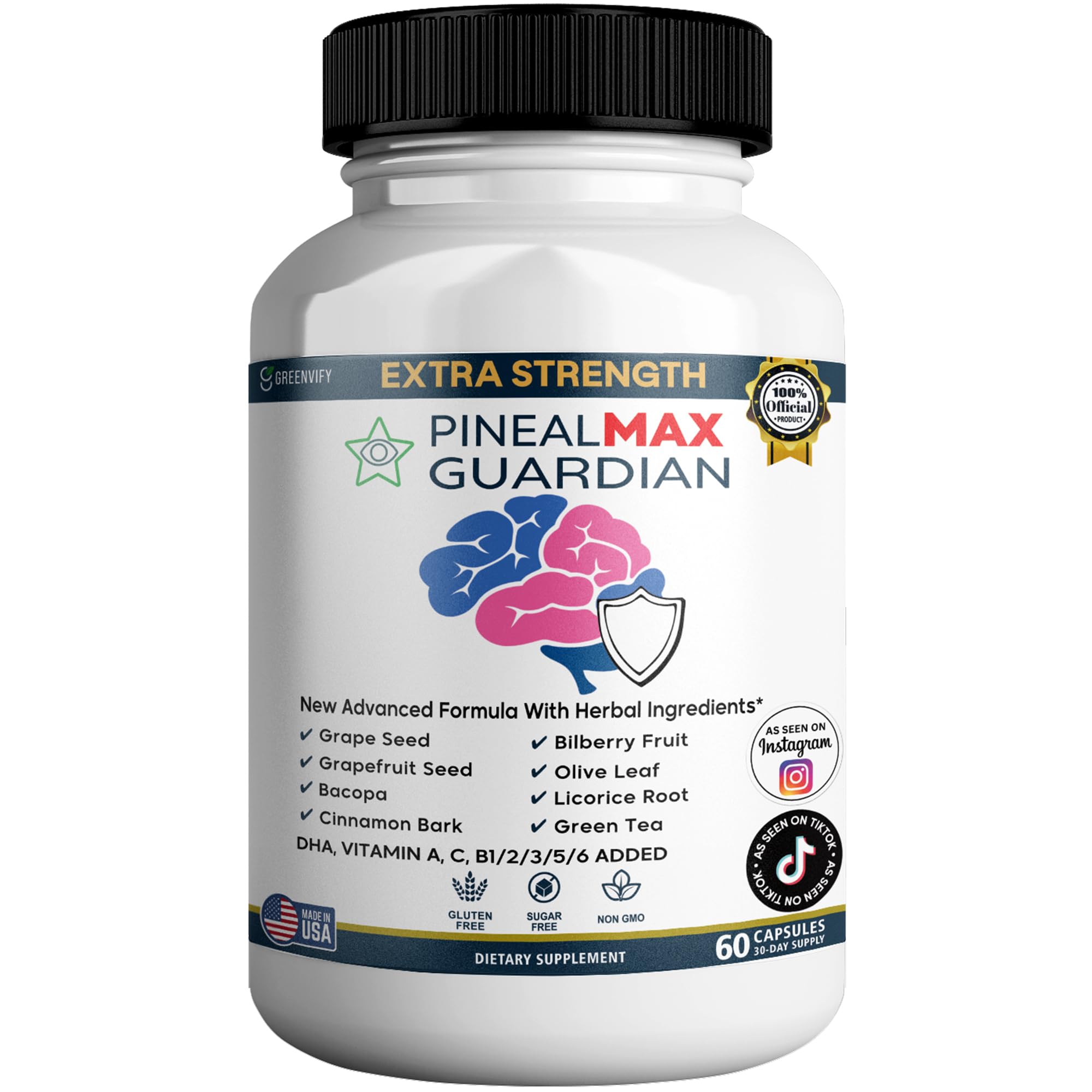 Elevate your wellness with GreenVify PinealMax Guardian Extra Strength Dietary Supplement, a carefully crafted blend of vitamins, minerals, and herbal extracts designed to support overall health and vitality. Each serving delivers targeted nutrition to help maintain mental clarity, promote balanced energy levels, and support the body's natural wellness functions. Our extra strength formula combines premium herbal ingredients with essential nutrients to create a powerful supplement you can trust. With 60 capsules per bottle (a 30-day supply), PinealMax Guardian makes it easy to include high-quality nutrition in your daily routine. Made with non-GMO ingredients in a GMP-certified facility, you can count on purity, safety, and effectiveness in every dose.