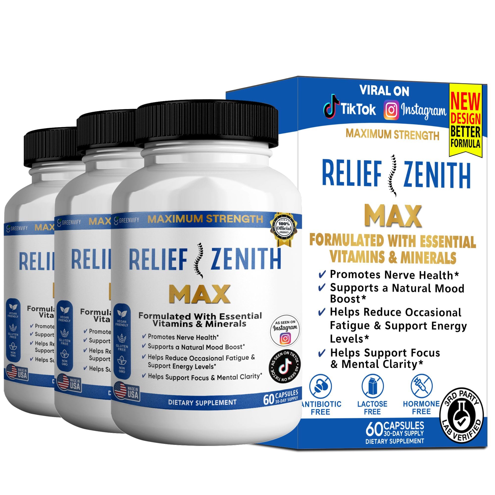 GREENVIFY Relief Zenith Max Dietary Supplement Nerve Health & Mood Support 60 Capsules 30-Day Supply (3)