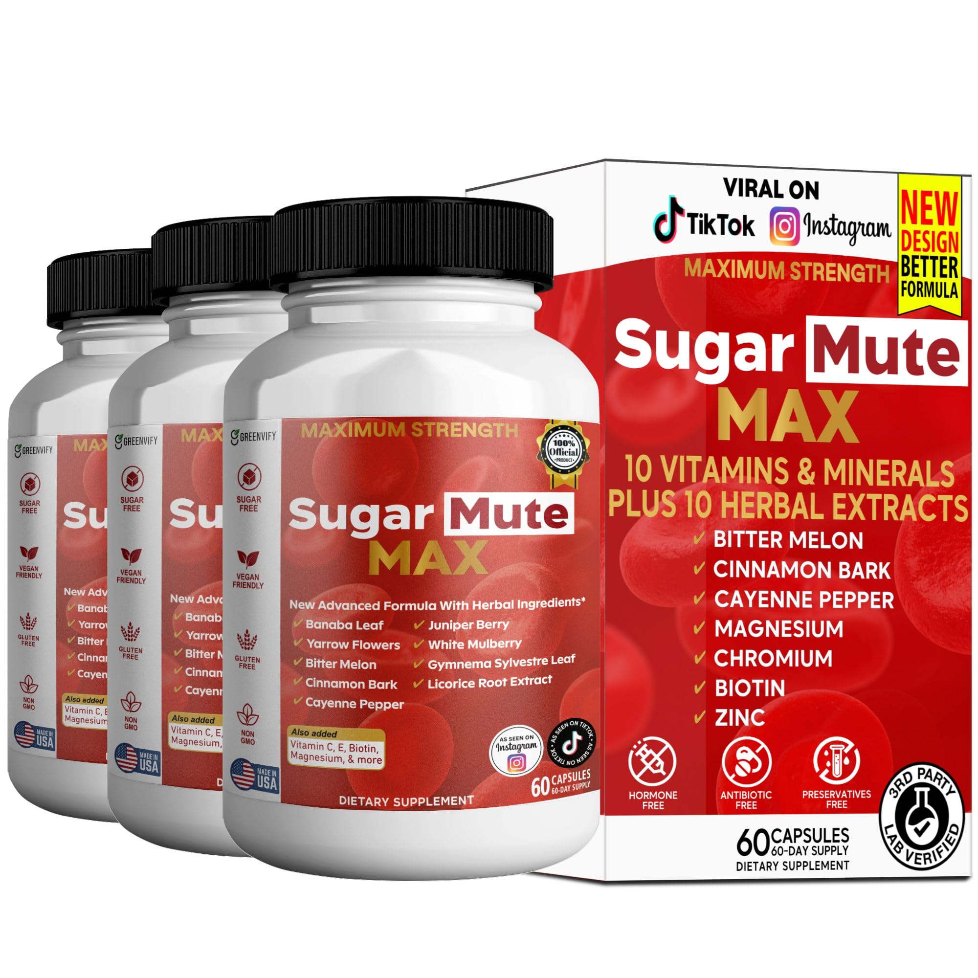 GREENVIFY Sugar Mute Max Blood Sugar Support 60 Veggie Capsules with Banaba Leaf Juniper Berry Vitamins & Herbs (3)