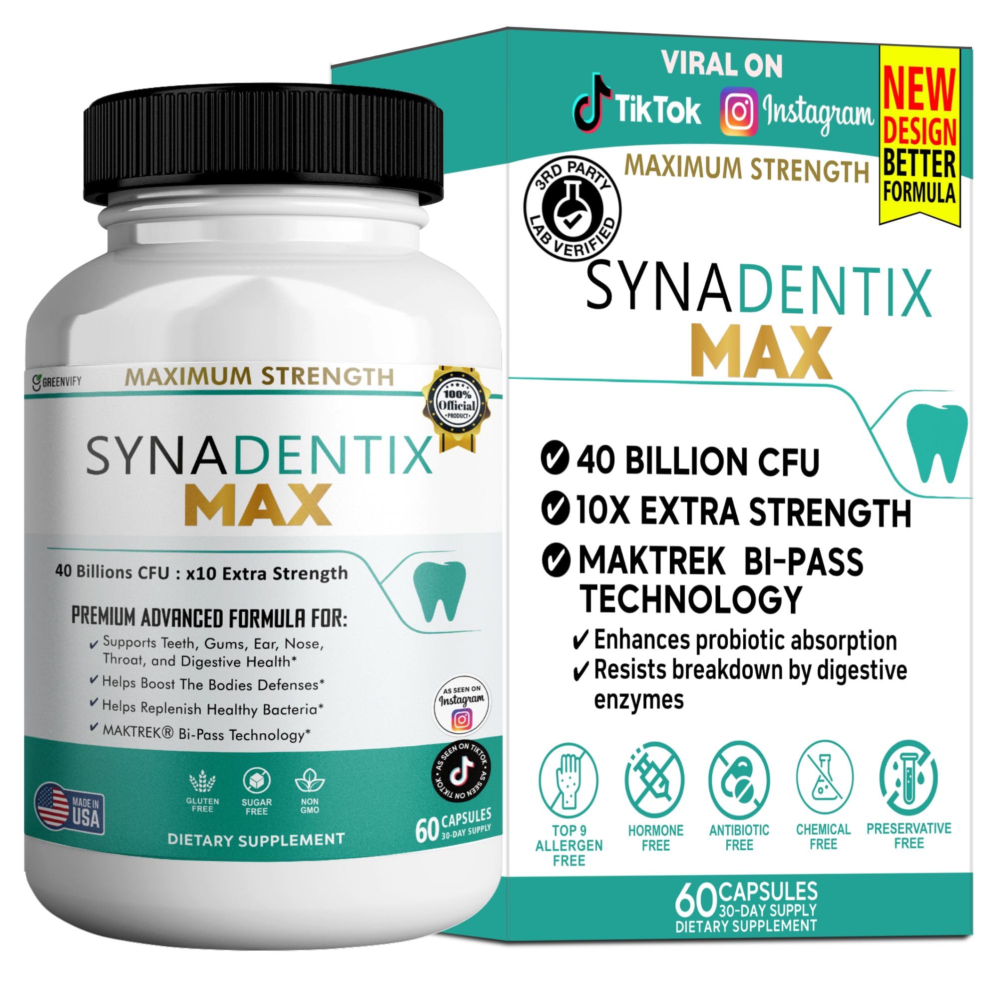 GREENVIFY SynaDentix Max Probiotic Supplement 40 Billion CFU MAKTREK Bi-Pass Technology 60 Capsules 30-Day Supply (1)