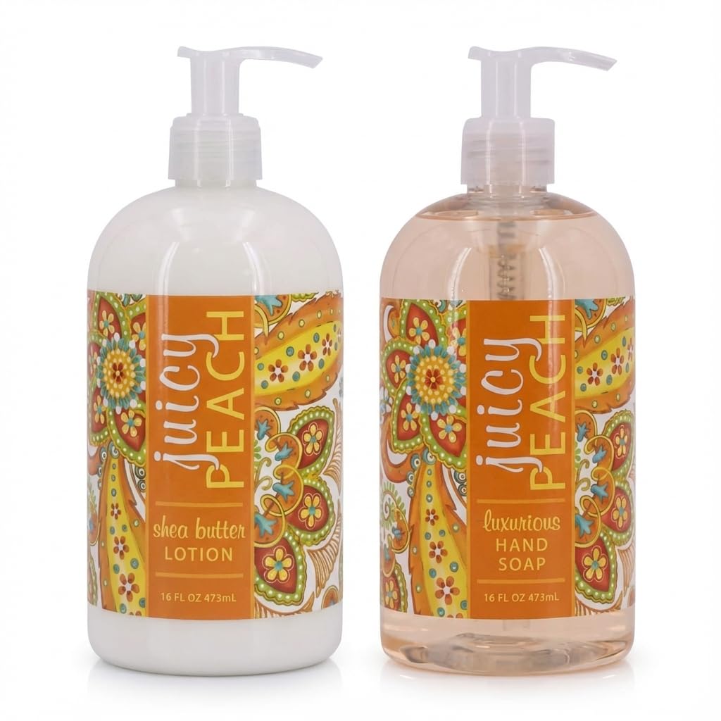 Crafted with Care in the USA High-quality ingredients Designed to elevate your everyday with premium fragrance and performance. Gift-Ready Packaging Attractively boxed for effortless gifting Ideal for hostess gifts, birthdays, or guest bathrooms. Gentle Yet Effective Soap Rich lather cleanses without over-drying Suitable for daily hand or body use Fresh, uplifting fragrance. Nourishing Formula for Soft Skin Lotion enriched with shea butter, cocoa butter, and essential oils Lightweight texture absorbs quickly. Peach-Infused Skincare Duo Includes one Juicy Peach hand soap and one hydrating lotion Sweet, fruity scent evokes fresh-picked summer peaches.