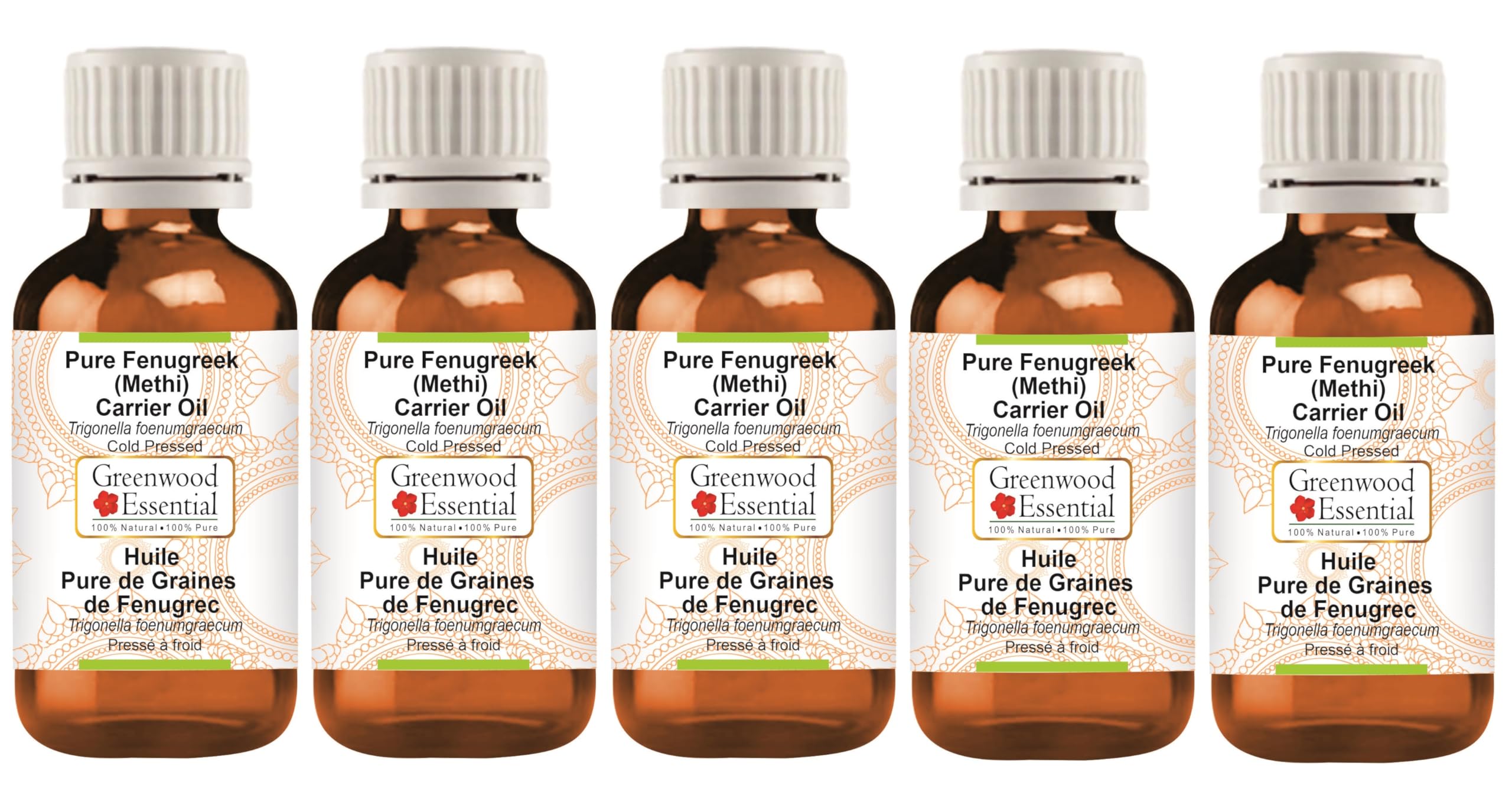 Greenwood essential pure Bockshorn clover (methi) carrier oil (trigonella foenumgraecum) natural therapeutic quality cold pressed.About Greenwood Essential: We are the largest brand for essential and carrier oils in India with satisfied customers in over 100 countries.We specialize in obtaining finest natural oils from perfect sources around the world.No manufacturer or country can produce all oils of good quality at a location/country.There are specialized manufacturers who produce specific oils with natural ingredients that are specific for this region or this country, for example the best oregano oil in Moldova, the best lavender oil in Spain, the best rosehip kernel oil comes from the Andes in South America.Our oils are certified naturally and purely with traceable origin and of the highest quality that you can buy for money.We have highly developed test devices.All of our programs have a certificate of origin and are only accepted after a strict purity test.We are also class leading manufacturers of one of the best selection of natural personal care products in India.We strive to satisfy each of our customers Ingredients / ingredients Bockshorn clover Instructions Cold -pressed or carrier oils can be applied directly to the skin.It is obtained from plant sources.Use it alone or with other oils to maintain your skin.It can also be used to dilute essential oils to transport them into the skin.Attention: This product has no childproofing.Keep away from children. More application: cold -pressed or carrier oils can be applied directly to the skin.It is obtained from plant sources.Use it alone or with other oils to maintain your skin.It can also be used to dilute essential oils to transport them into the skin.Attention: This product has no childproofing.Keep away from children.Aroma: carrier oils are not aromatic.Most natural carrier oils have a weak or no aroma.We do not add synthetic fragrances so that our oils smell well.Pure Bockshorn clover (methi) carrier oil is used for therapeutic purposes and has a very weak or no aroma.Use it to experience therapeutic advantages.Quantity - 100ml x 5 (16.9 OZ) container type - high -quality brown las bottle.Method of extraction: cold pressed botanical name - trigonella foenumgraecum pure, natural, undiluted carrier oil in therapeutic quality, alcohol -free, solvent -free, vegan, free of animal experiments.100 % risk-free purchase: We have been offering a ""money back guarantee without questions"" for 10 years.We believe that our oils will bring you permanent therapeutic advantages. Greenwood Essential Reines Bockshornklee (Methi) Träger Öl (Trigonella foenumgraecum) Natürliche Therapeutische Qualität kaltgepresst. Über Greenwood Essential: Wir sind die größte Marke für ätherische und Trägeröle in Indien mit zufriedenen Kunden in über 100 Ländern. Wir sind darauf spezialisiert, feinste natürliche Öle aus einwandfreien Quellen auf der ganzen Welt zu beziehen. Kein Hersteller oder Land kann alle Öle von guter Qualität an einem Standort/Land produzieren. Es gibt spezialisierte Hersteller, die spezifische Öle mit Natürlichen Inhaltsstoffen herstellen, die für diese Region oder dieses Land spezifisch sind, zum Beispiel findet man das beste Oreganoöl in Moldawien, das beste Lavendelöl in Spanien, das beste Hagebuttenkernöl stammt aus den Anden in Südamerika. Unsere Öle sind zertifiziert natürlich und rein mit rückverfolgbarer Herkunft und von höchster Qualität, die man für Geld kaufen kann. Wir verfügen über hochentwickelte Prüfgeräte. Alle unsere Sendungen haben ein Ursprungszeugnis und werden nur nach strenger Reinheitsprüfung akzeptiert. Wir sind auch klassenführende Hersteller einer der besten Auswahl an Natürlichen Körperpflegeprodukten in Indien. Wir bemühen uns, jeden unserer Kunden zufrieden zu stellen INHALTSSTOFFE / ZUTATEN Bockshornklee GEBRAUCHSANWEISUNG Kaltgepresste Oder Trägeröle Können direkt auf die Haut aufgetragen werden. Es wird aus pflanzlichen Quellen gewonnen. Verwenden Sie es allein oder mit anderen Ölen, um Ihre Haut zu pflegen. Es kann auch verwendet werden, um ätherische Öle zu verdünnen, um sie in die Haut zu transportieren. ACHTUNG: Dieses Produkt hat keine Kindersicherung. Von Kindern fernhalten. MehrANWENDUNG: Kaltgepresste oder Trägeröle können direkt auf die Haut aufgetragen werden. Es wird aus pflanzlichen Quellen gewonnen. Verwenden Sie es allein oder mit anderen Ölen, um Ihre Haut zu pflegen. Es kann auch verwendet werden, um ätherische Öle zu verdünnen, um sie in die Haut zu transportieren. ACHTUNG: Dieses Produkt hat keine Kindersicherung. Von Kindern fernhalten. AROMA: Trägeröle sind NICHT aromatisch. Die meisten Natürlichen Trägeröle haben ein SCHWACHES ODER KEIN AROMA. Wir fügen Keine Synthetischen Duftstoffe Hinzu, Damit unsere Öle gut Riechen. Reines Bockshornklee (Methi) Träger Öl Wird für Therapeutische Zwecke Verwendet und hat ein Sehr Schwaches oder Kein Aroma. Verwenden Sie es, um Therapeutische Vorteile zu Erfahren. Quantität – 100ml X 5 (16.9 oz) Behältertyp – Hochwertige Braunglasflasche. METHODE VON EXTRAKTION: Kalt gepresst Botanischer Name – Trigonella foenumgraecum Reines, Natürliches, Unverdünntes Trägeröl in Therapeutischer Qualität, alkoholfrei, lösungsmittelfrei, Vegan, Tierversuchsfrei. 100 % RISIKOFREIER KAUF: Wir bieten seit 10 Jahren eine „Geld-zurück-Garantie ohne Fragen“ an. Wir glauben, dass unsere Öle Ihnen dauerhafte therapeutische Vorteile bringen werden.Greenwood Essential Naturreine Bockshornklee (Methi) Träger Öl (Trigonella foenumgraecum) Naturreine Therapeutische Qualität kaltgepresst (Pack of Five) 100ml X 5 (16.9 oz)