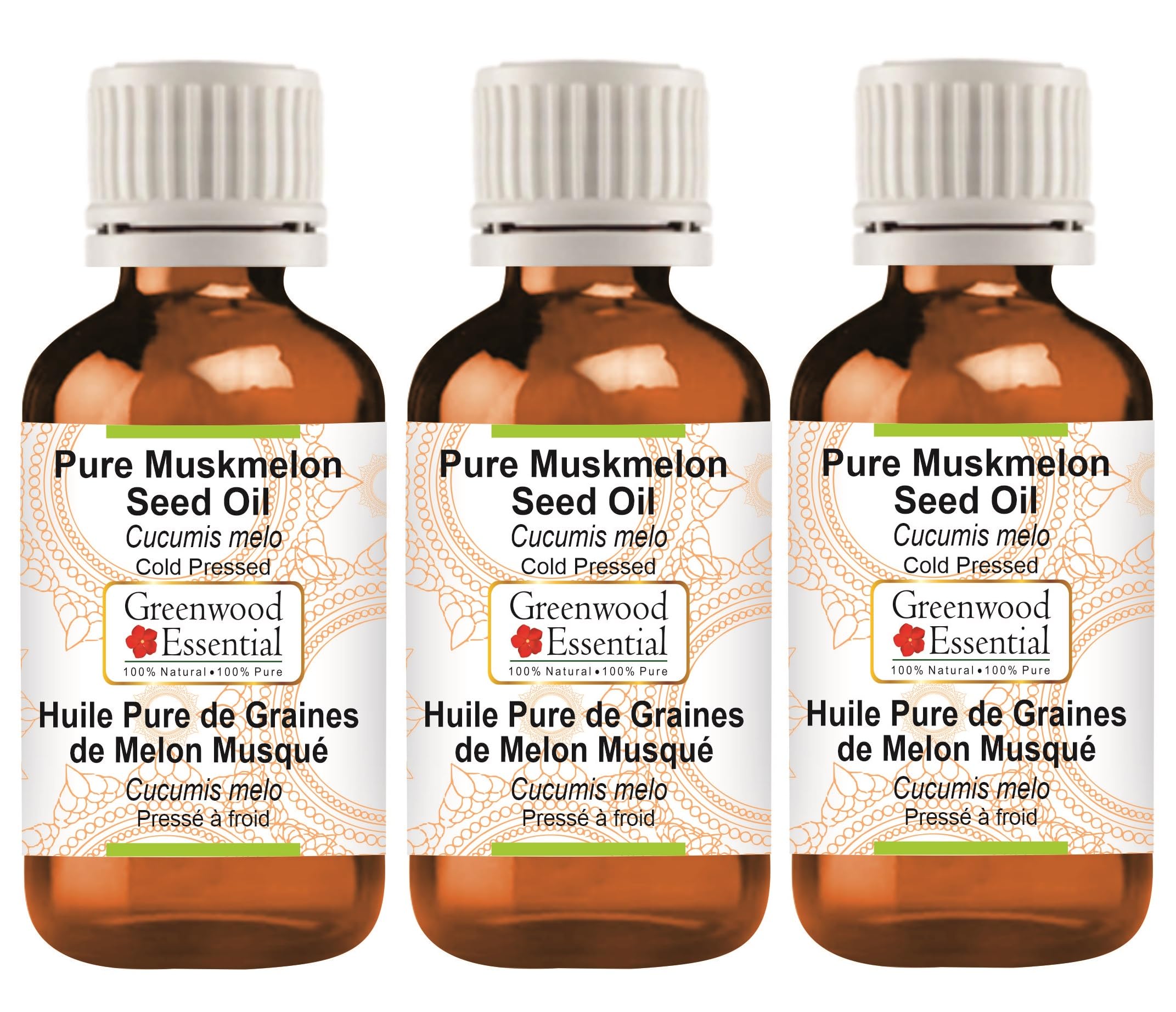 Greenwood Essential Pure Muskmelon Seed Oil (Cucumis melo) 100% Natural Therapeutic Grade Cold Pressed for Personal Care (Pack of Three) 100ml X 3 (10 oz) 100ml X 3 (10 Ounce) with Plastic Euro Dropper