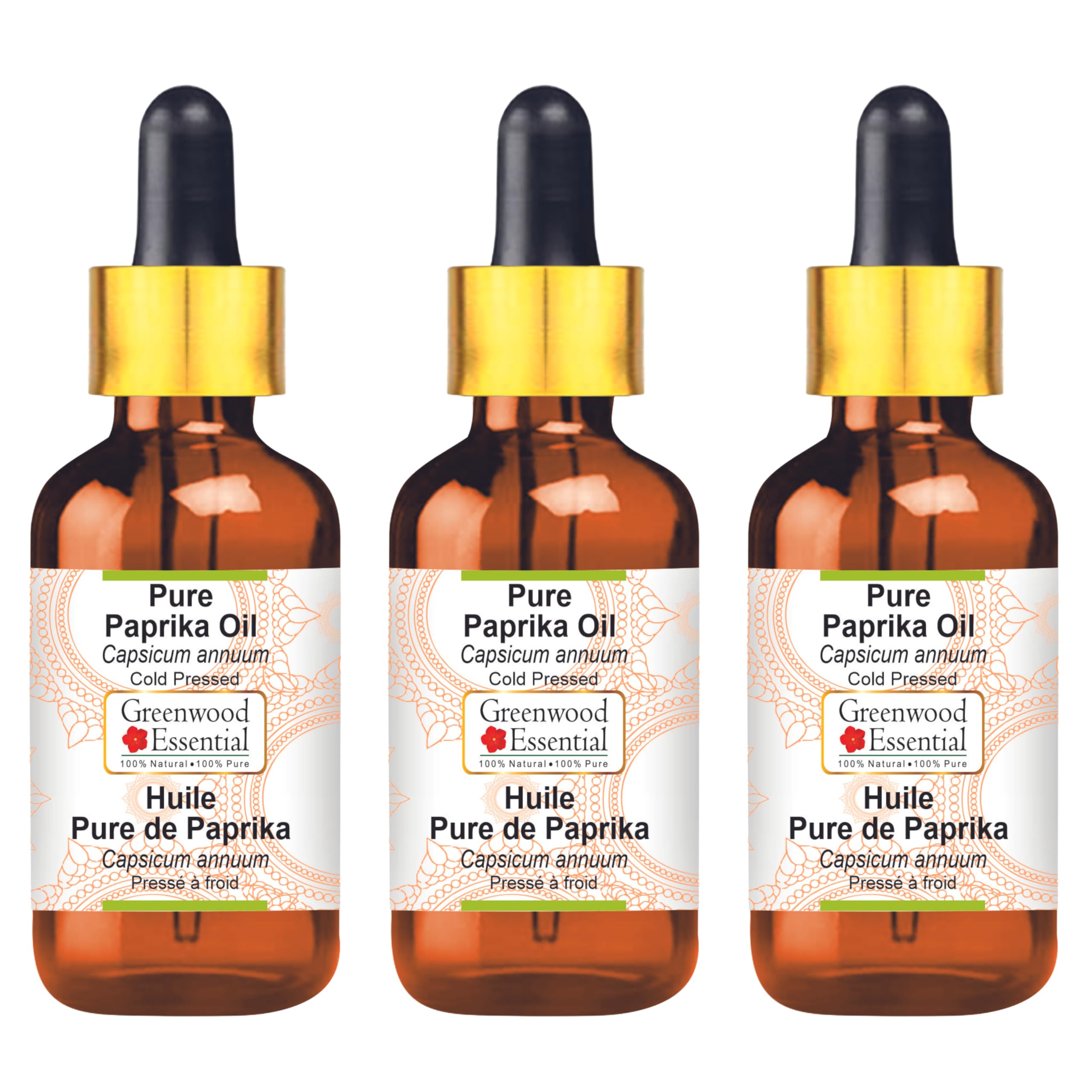 Greenwood Essential Pure Paprika Oil (Capsicum annuum) with Glass Dropper Cold Pressed (Pack of Three) 100ml X 3 (10 oz)
