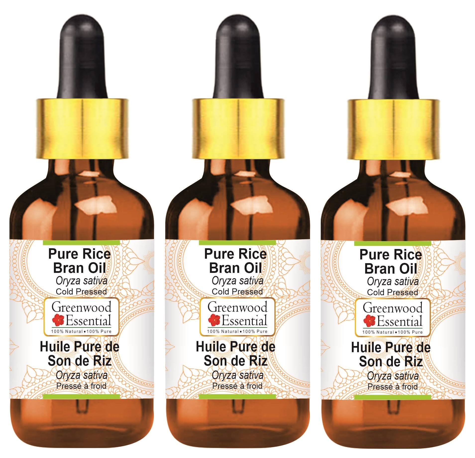 Greenwood Essential Pure Rice Bran Oil (Oryza sativa) with Glass Dropper Cold Pressed (Pack Of Three) 100ml X 3 (10 oz)