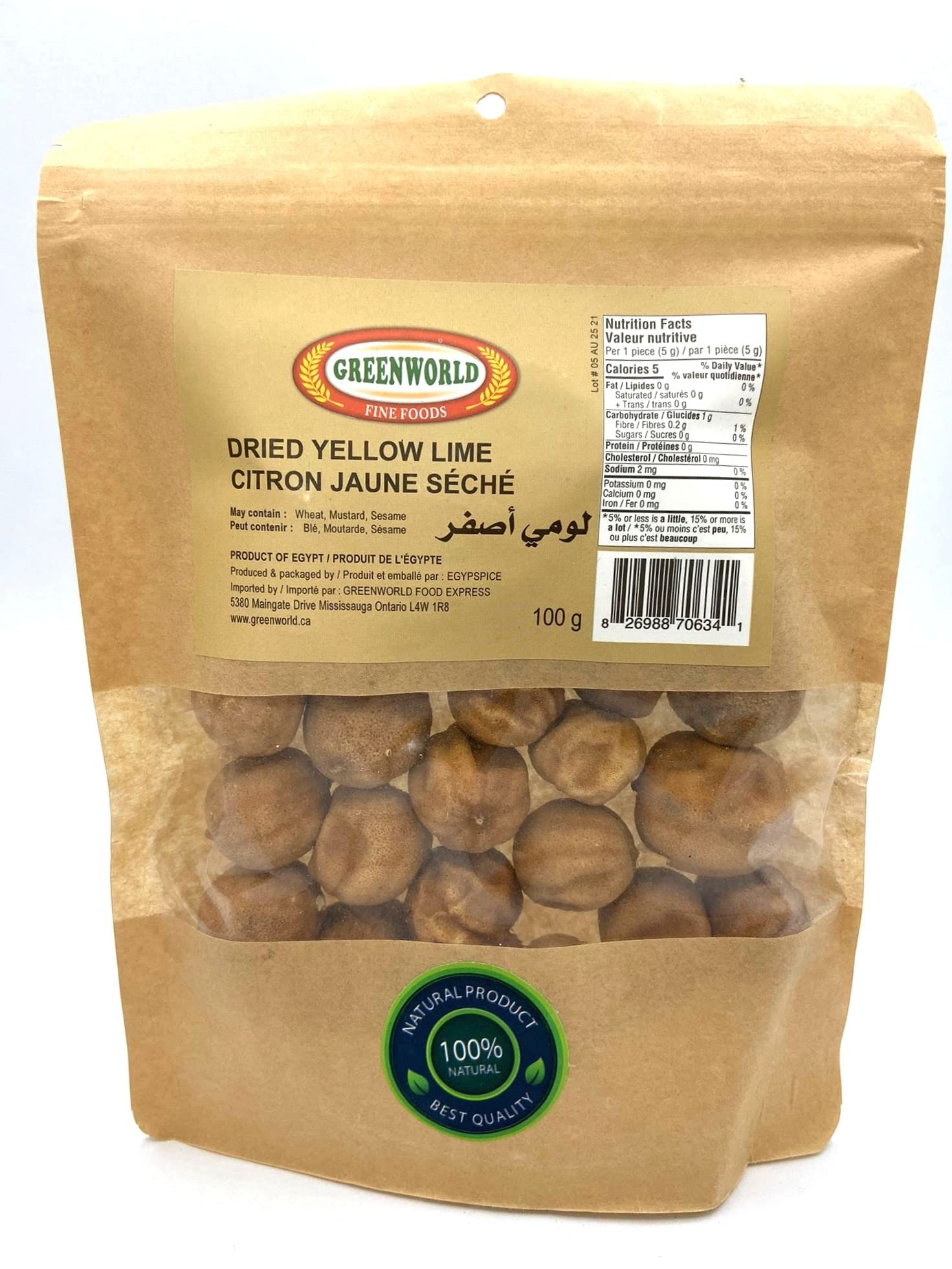 Yellow lemons are actually dried limes and owe their misnomer to English translation from Arabic. They're used in the Middle East and surrounding regions as a souring agent in chutneys, soups, and stews, and even ground into flatbreads. They are made by boiling ripe limes in salt water, and then sun drying until the insides turn yellow. The powder made from yellow lemons has a sweet-tart flavor that is unique and has no substitute. yellow limes are usually used in legume, seafood, or meat dishes. They are pierced, peeled, or crushed before adding them to the dish. After cooking they become softer and edible. They can also be powdered and added to rice dishes. Yellow limes are strongly flavored. They taste sour and citrusy like lime but they lack the sweetness of fresh limes. Because they are preserved they also have a slightly bitter, fermented flavor.yellow limes are usually used in legume, seafood, or meat dishes. The powder made from yellow lemons has a sweet-tart flavor that is unique and has no substitute. They're used in the Middle East and surrounding regions as a souring agent in chutneys, soups, and stews, and even ground into flatbreads. Product of Egypt. Dried, Fresh, and Natural.