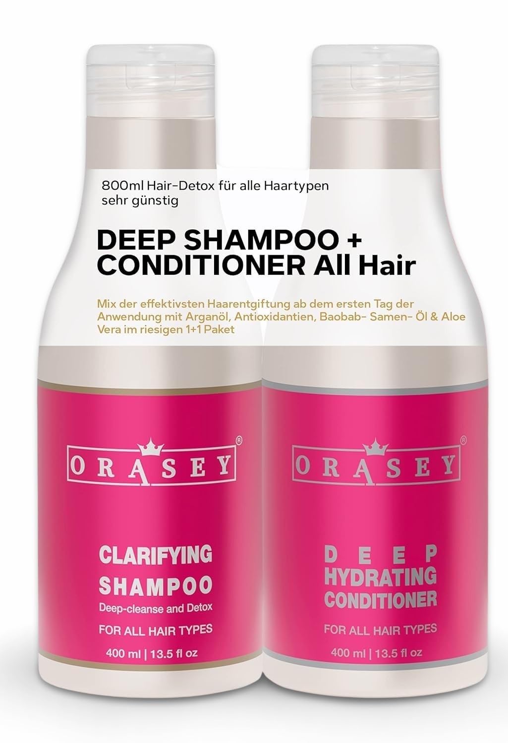 For hair detox: cleansing shampoo also known as detox. Thanks to the active ingredients in the cleansing shampoo, it removes all impurities, grease, deposits from conditioners, hair treatments and styling products. A complex of silk amino acids - moisturizes the scalp, increases elasticity and has an antistatic effect. Enriched with UV protection. Use as a hair detox: apply the shampoo to wet hair, massage into the scalp for 1-2 minutes, rinse with running water. Go with Orasey deep moisture conditioner. For best results, use once a week. For the treatment of keratin: for optimal results we have enriched our cleansing shampoo from Orasey with advanced Timed PH Elevating technology, which opens the hair follicles while using the Orasey keratin (step 2). Application for keratin treatment: Apply the shampoo to wet hair, massage it into the scalp. Rinse it off. Do not use as aftercare - if the hair has been treated with keratin. Key points: As a pre-treatment for keratin treatment Orasey suitable Deeply cleanses hair cuticle Removes product residues and impurities from hair and scalp Advanced timed pH-elevating technology opens the hair cuticle for the best results Formulated with nutrients and keratin protein oils to nourish and protect hair during the day Enriched with vitamin B and aloe Vera Made with love for hair: 100 free of SLS, parabens, alcohol, silicones, Cruelty-free vegan Fair Trade protection against UV radiation Suitable for all hair types Orasey deep moisture conditioner is a sodium chloride-free formula with a low pH value, which works as a daily care in combination with Orasey deep moisture shampoo and deep cleansing detoxifying shampoo. Key points: Suitable as aftercare for Orasey keratin treatment and Orasey deep moisture shampoo and deep INGREDIENTS water, cetyl alcohol, dimethicone, glycerin, sorbitol, antiphenofrimonium chloride, cetrimonium chloride, polysorbates 20, fragrances, dimethiconol, phenoxyethanol, isopropyl alcohol, benzyl alcohol, coumarin, lactic acidSuitable for all hair types. Smooth and shiny. Gives the hair a silky feeling. Enriched with cold-pressed baobab seed oil aloe vera. For hair removal.Set voor ontgifting van diep vocht (clarifying shampoo), dieptereinigende shampoo en conditioner, 2 x 400 ml, baobaba-olie en aloë vera, vrij van parabenen, sulfaatvrij, voor alle haartypes Voor haarontgifting: reinigende shampoo bekend ook als ontgifting. Dankzij de werkzame stoffen in de reinigende shampoo verwijdert het alle onzuiverheden, vet, afzettingen van conditioners, haarbehandelingen en stylingsproducten. Een complex van aminozuren van zijde - hydrateert de hoofdhuid, verhoogt de elasticiteit en werkt antistatisch. Verrijkt met uv-bescherming. Gebruik als haarontgifting: breng de shampoo aan op nat haar, masseer het gedurende 1-2 minuten in de hoofdhuid, spoel het af met stromend water. Ga met Orasey diepe vochtconditioner. Voor de beste resultaten gebruik je eenmaal per week. Voor de behandeling van keratine: voor optimale resultaten hebben wij onze reinigende shampoo van Orasey verrijkt met geavanceerde Timed PH Elevating technologie, die de haarzakjes tijdens het gebruik van de Orasey keratine opent (stap 2). Toepassing voor keratinebehandeling: Breng de shampoo aan op nat haar, masseer het in de hoofdhuid. Spoel het af. Gebruik niet als naverzorging - als het haar met keratine is behandeld. Belangrijkste punten: Als voorbehandeling voor keratinebehandeling Orasey geschikt Reinigt haarcuticula diep Verwijdert productresten en onzuiverheden van haar en hoofdhuid Geavanceerde timed pH-elevating technologie opent de haarkuticula voor de beste resultaten Met voedingsstoffen en keratine-eiwitoliën geformuleerd om het haar overdag te voeden en te beschermen Verrijkt met vitamine B en aloë Vera met liefde voor haar gemaakt: 100 vrij van SLS, parabenen, alcohol, siliconen, dierproefvrij veganistisch Fair Trade bescherming tegen uv-straling Geschikt voor alle haartypes Orasey diepe vochtconditioner is een natriumchloridevrije formule met lage pH-waarde, die in combinatie met Orasey diep vocht- shampoo en diepreinigende ontgiftingsshampoo als dagelijkse verzorging werkt kt. Belangrijkste punten: Geschikt als naverzorging bij Orasey keratine behandeling en Orasey diep vocht- shampoo en diep INGREDIËNTEN water, cetylalcohol, dimethicone, glycerine, sorbitol, antifenofrimoniumchloride, cetrimoniumchloride, polysorbaten 20, geuren, dimethiconol, fenoxyethanol, isopropyl alcohol, benzylalcohol, coumarine, lactic zuurGeschikt voor alle haartypes. Glad en glanzend. Geeft het haar een zijdeachtige gevoel. Verrijkt met koudgeperste baobab-zaadolie aloë vera. Voor ontharing.