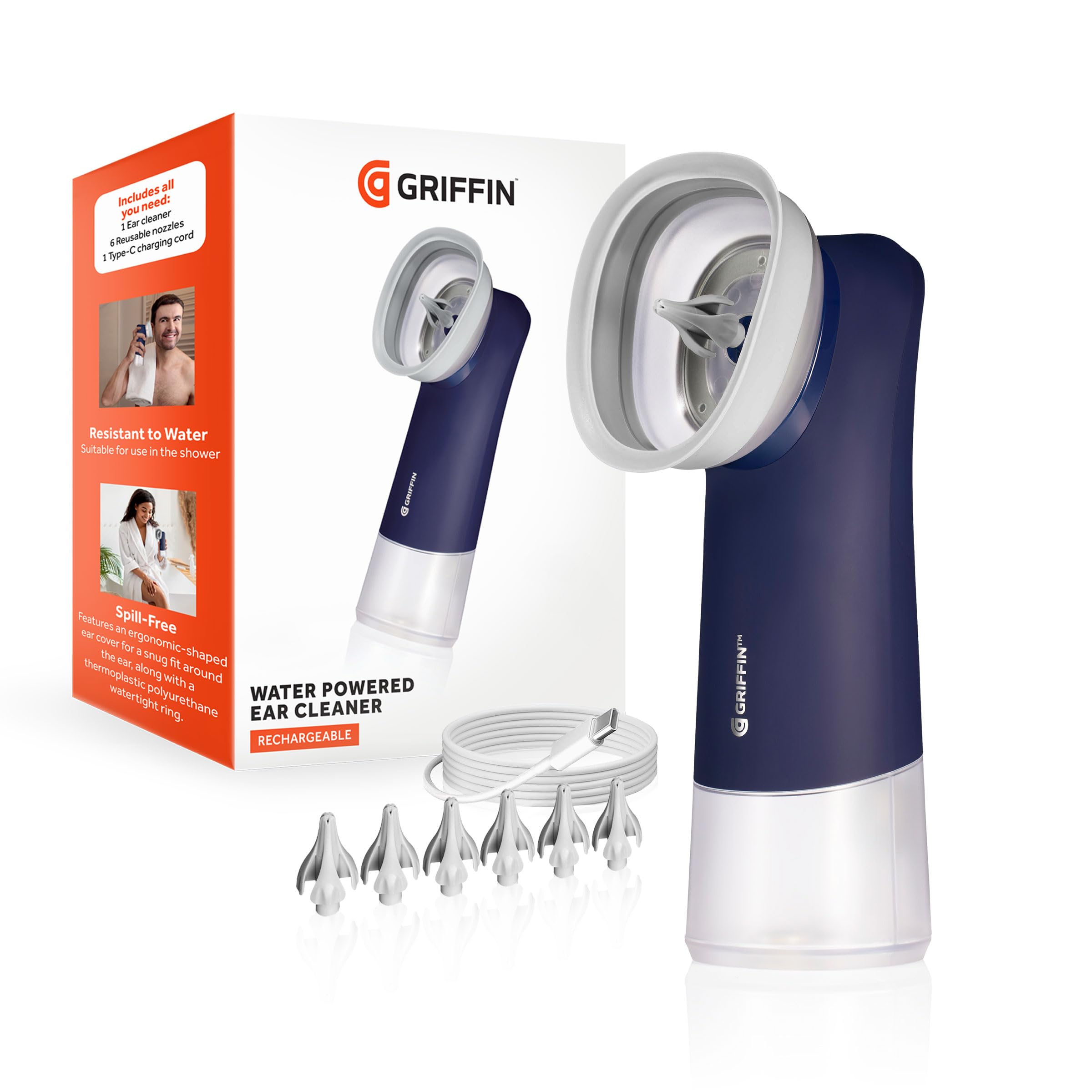 Griffin Water-Powered Ear Cleaner Safe Gentle Earwax Removal System with Adjustable Pressure & Reusable Tips for Comfortable Hygiene Care (Includes 6 Replacement Nozzle Tips USB-C Charging Cord).