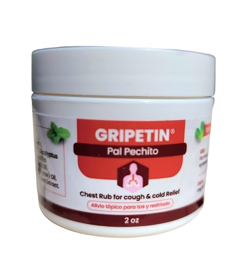 Gripetin Chest Rub, also known as "Pal Pechito," is a soothing aromatic ointment traditionally used for cough and cold comfort. Made with menthol, camphor, eucalyptus oil, peppermint oil, thyme, and arnica, this warming chest rub releases refreshing vapors that help provide a sense of relief and relaxation when applied to the chest, back, or throat area. Its unique herbal formula delivers a cooling and warming sensation that helps ease breathing discomfort and promotes comfort during cold seasons. Ideal for nighttime use, Gripetin Chest Rub creates a calming aromatic experience for the whole family. Gripetin Chest Rub, también conocido como "Pal Pechito", es una pomada aromática calmante tradicionalmente utilizada para brindar confort durante la tos y el resfriado. Elaborada con mentol, alcanfor, aceite de eucalipto, aceite de menta, tomillo y árnica, esta pomada reconfortante libera vapores refrescantes que ayudan a proporcionar una sensación de alivio y relajación cuando se aplica en el pecho, la espalda o el área de la garganta. Su fórmula herbal única ofrece una sensación refrescante y cálida que ayuda a aliviar la incomodidad al respirar y promueve el bienestar durante la temporada de resfriados. Ideal para uso nocturno, Gripetin Chest Rub crea una experiencia aromática calmante para toda la familia.Soothing menthol chest rub for cough and cold relief Aromatic ointment made with camphor, eucalyptus, peppermint, thyme, and arnica. Provides warming and cooling sensations to promote comfort and easier breathing Traditional "Pal Pechito" herbal formula for chest, back, and throat application Ideal for nighttime use and cold season comfort Pomada calmante de mentol para alivio de tos y resfriado Pomada aromática elaborada con alcanfor, eucalipto, menta, tomillo y árnica Fórmula herbal tradicional "Pal Pechito" para aplicar en pecho, espalda y garganta.