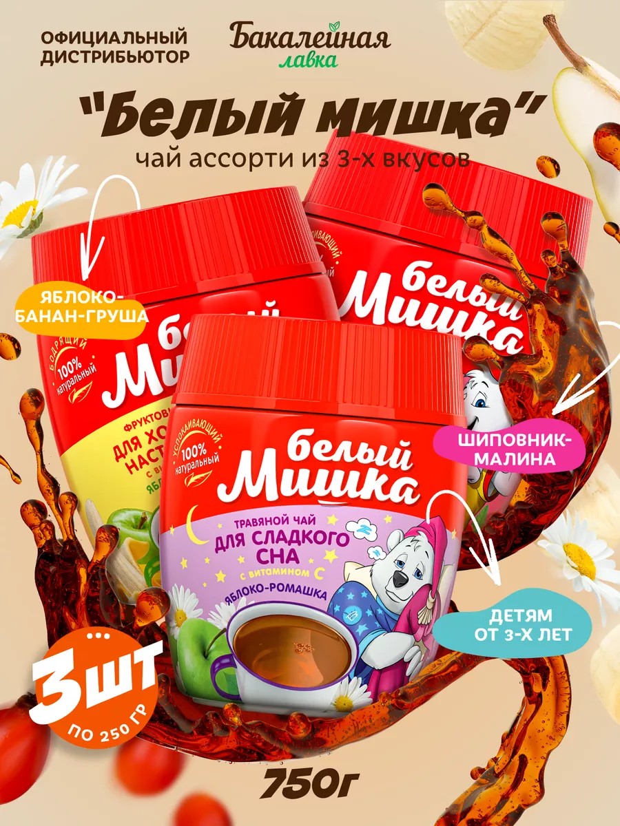 Чай детский Белый мишка с витамином С - это полезный детский напиток для детей старше 3 лет. Быстрорастворимый чай великолепно растворяется в воде, обладает легкой сладостью и отличными вкусами. Чай особенно полезен в холодное время года. Пейте чай горячим или холодным всей семьёй! Удобная и герметичная упаковка позволяет сохранять свойства напитка на протяжении всего периода потребления. Доступная цена, оптимальный объем упаковки и высокое качество - вот отличительные особенности детского чая. Гранулированный ягодный или фруктовый чай наполняет организм витаминами, входящими в состав натуральных компонентов чая; способствует развитию вкусовых ощущений; содержит натуральные экстракты. Вкусы в комплекте: ягодный (шиповник + малина), травяной (яблоко + ромашка), фруктовый (яблоко + банан + груша).