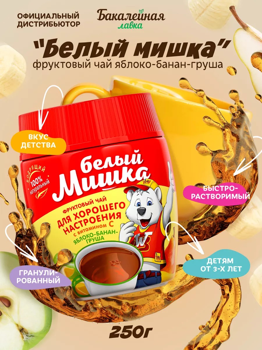 White Bear Children's Tea with Apple, Pear, Banana, and Vitamin C is a healthy drink for children over 3 years old. This instant tea dissolves perfectly in water, has a light sweetness, and flavors of apple, banana, and pear. Enriched with vitamin C, this tea is especially beneficial during the cold season. Enjoy it hot or cold with the whole family! Convenient, airtight packaging preserves the drink's properties throughout the entire drinking period. Affordable price, optimal packaging volume, and high quality are the hallmarks of this children's tea. This granulated fruit tea replenishes the body with vitamins found in the natural ingredients of the tea; promotes taste development; and contains natural extracts.