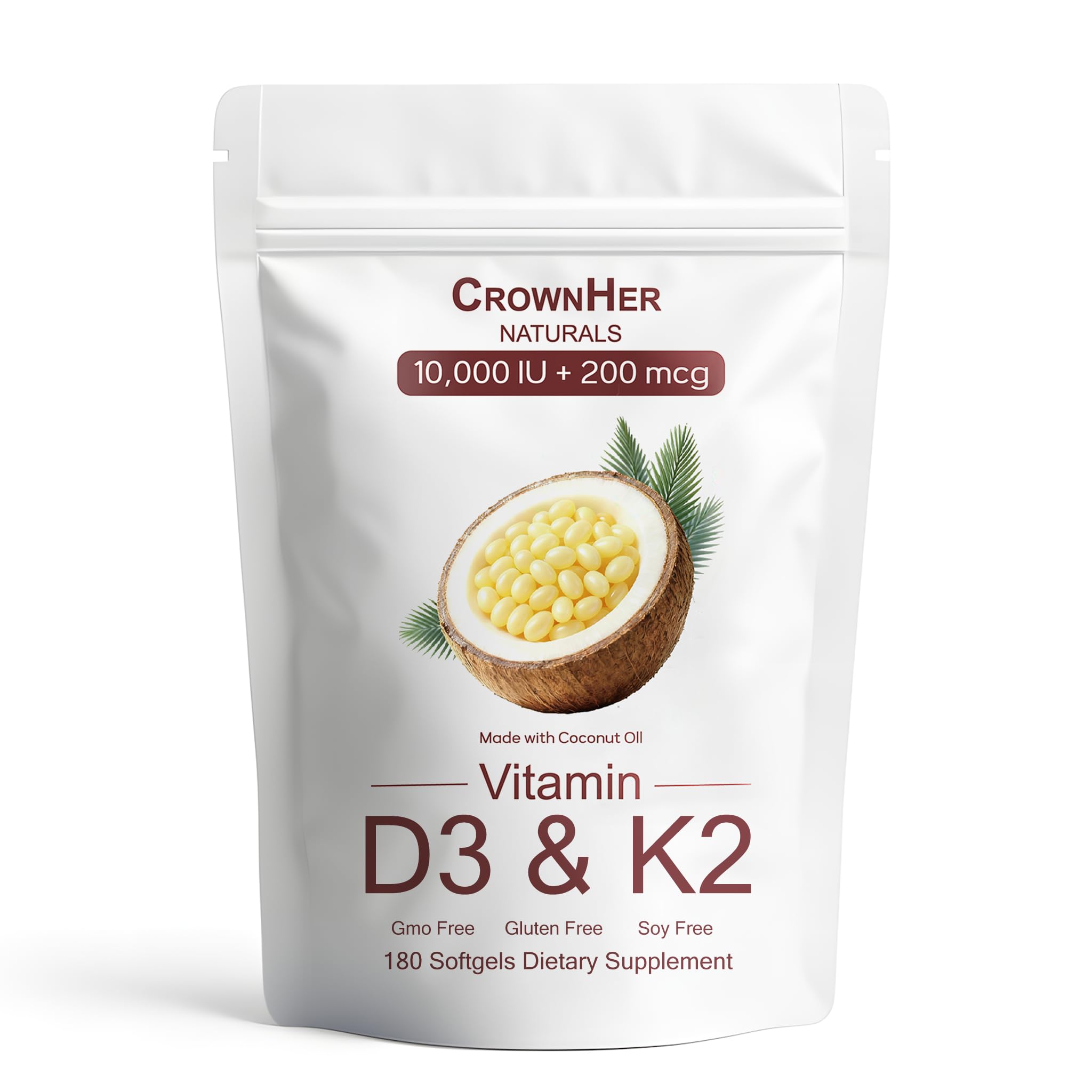 Easy One-a-Day Serving Each serving of CrownHer D3 K2 Vitamin is just one softgel per day. Every bag contains 180 softgels of D3 K2 Vitamin 10,000 IU with Coconut Oil by CrownHer, offering long-lasting supply and daily convenience. Gentle, Clean Easy to Absorb Made with non-GMO ingredients, this CrownHer Vitamin D3 K2 supplement is gluten-free and soy-free. The liquid softgel format of CrownHer D3K2 is gentle on the stomach and absorbs faster than traditional tablets. Holistic Bone Wellness Support Vitamin D3 supports calcium absorption while Vitamin K2 works synergistically to help direct calcium where it's needed. This CrownHer Vitamin D3 and K2 Supplements formula, also known as CrownHer Naturals D3K2, is designed to support bone density and overall balance. 2-in-1 D3 K2 Coconut Oil Softgels These CrownHer Naturals D3 K2 Coconut Oil softgels deliver a convenient 2-in-1 blend of Vitamin D3 and K2. As a premium D3 K2 Vitamin Supplement CrownHer, it supports bone strength, immune health, calcium utilization, and daily wellness for both women and men. Vitamin D3 10000 IU K2 200 mcg Formula The CrownHer Naturals – Vitamin D3 10,000 IU K2 supplement combines high-potency CrownHer D3 K2 Vitamin 10000 IU with Vitamin K2 (MK-7, 200 mcg). Formulated with organic coconut oil, this CrownHer Natural Vitamin D3 K2 Soft Gel helps support efficient nutrient absorption.