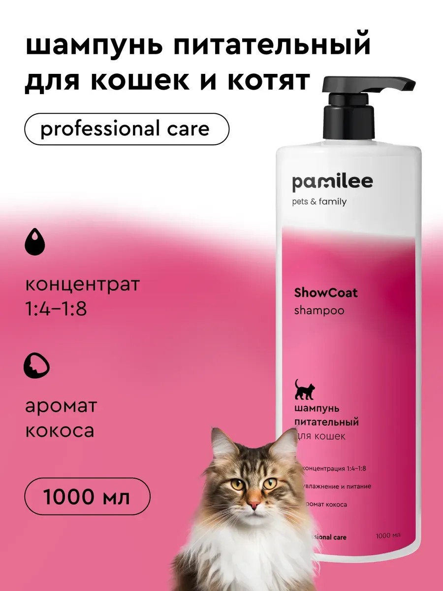 Pamilee Grooming Shampoo for cats cares for the animal's coat, restoring its healthy shine and volume. The coat becomes elastic and silky. The nourishing product quickly restores the hair structure, increasing blood circulation in the growth zones, and also relieves irritation, dryness and itching. Intended for cats and kittens. Suitable for animals with long white, black and colored hair. The concentrated shampoo for cats is economical in use, as it requires dilution with water. HOW TO USE: Shake the shampoo for animals; prepare a solution with warm water in a ratio of 1:4-1:8 (the concentration of the solution depends on the degree of contamination of the coat); apply to damp fur with massaging movements, having previously whipped it into a foam; leave for 1-10 minutes; rinse. Pamilee - professional cosmetics for animals (dogs and cats) is successfully used in grooming salons and at home.