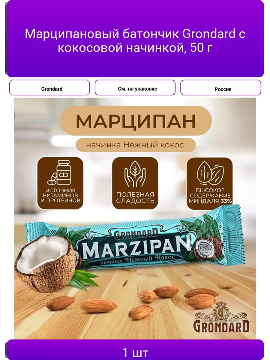 | Комплектация | Марципановый батончик Grondard с кокосовой начинкой, 50 г |