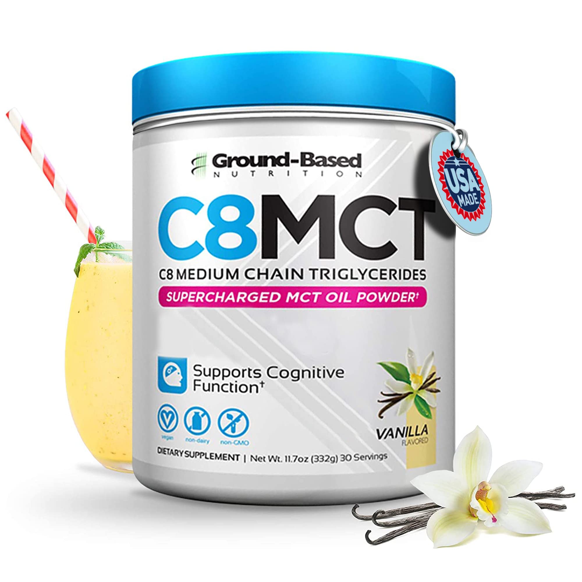 Ground-Based Nutrition C8 MCT Oil Powder Supercharged Medium Chain Triglycerides MCT Oil Powder Vegan-Friendly Non-GMO Powdered C8 MCT Oil Ketogenic MCT Coffee Creamer No Stevia (Vanilla)