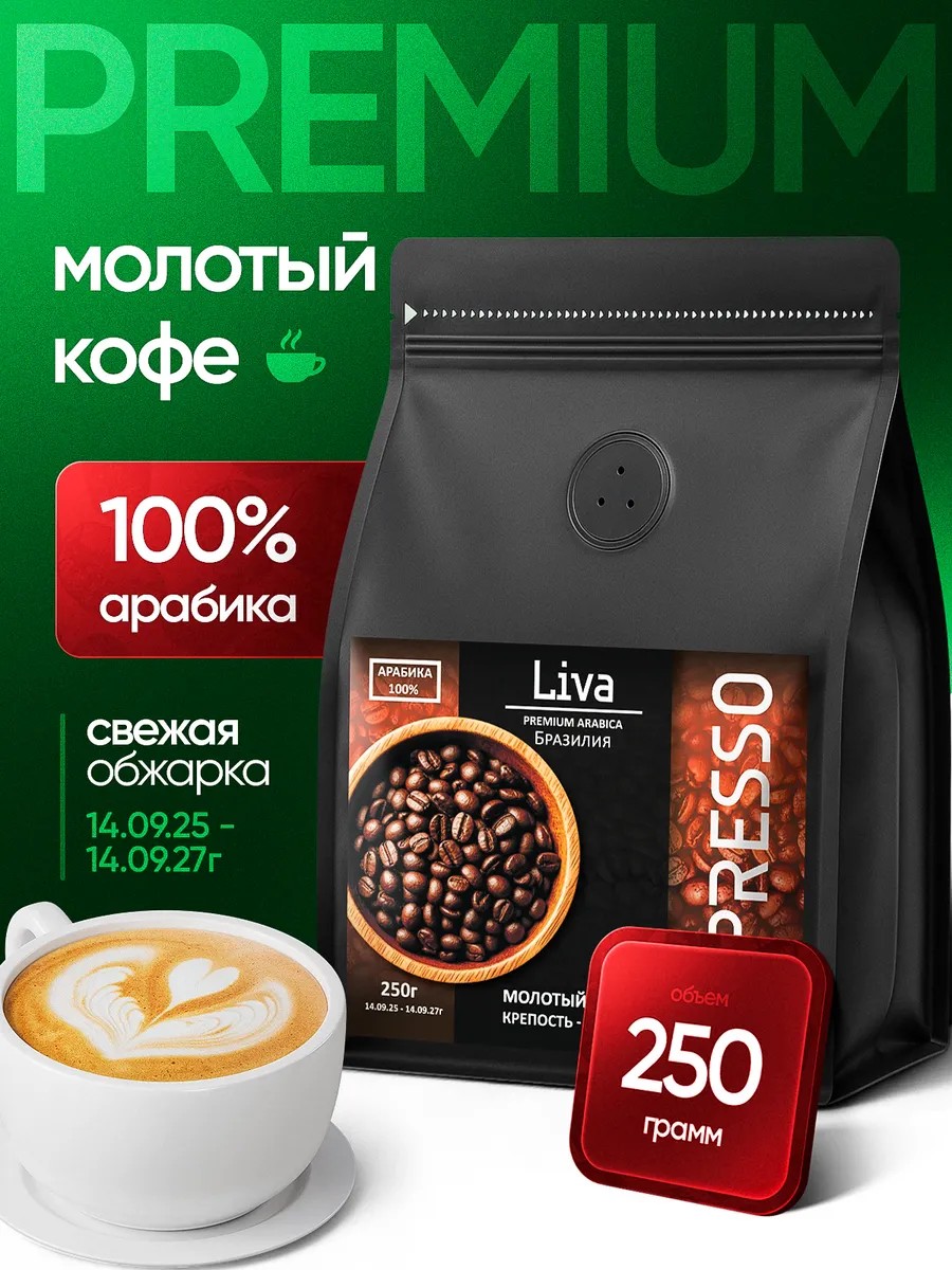 Натуральный молотый кофе для кофемашин Liva Espresso– это 100% бразильская арабика, он выращен на лучших землях Сул де Минас в Бразилии на высоте 500-1300 метров над уровнем моря. Это классический молотый кофе средней обжарки со сбалансированным вкусом, ярким ароматом и густой пенкой. Мы с любовью отбираем кофейные зерна с лучших плантаций Бразилии - родины лучших сортов элитного кофе, чтобы обеспечить высокое качество каждой партии кофе. Процесс обжарки автоматизирован и обеспечивает полный цикл, а производство сертифицировано по мировому стандарту ХАССП, с контролем качества на каждом этапе. Чтобы сохранить неповторимый вкус и аромат свежеобжаренного кофе, мы предусмотрели специальную упаковку с многоразовым замком Zip-Lock. Молотый кофе идеально подходит для приготовления в турке, френч-прессе, гейзерных кофеварках и кофемашинах, в кофемашине, рожковой кофеварке, капсульной, гейзерной кофеварке, турке, фильтре, для заваривания в чашке, а также по восточному методу. Чашечка ароматного кофе Liva подарит вам незабываемые мгновения. Вы можете экспериментировать с различными вкусами и открывать для себя новые гастрономические радости. В нашем магазине есть бразильский кофе в зёрнах, бразильский молотый кофе и растворимый кофе посмотрите весь наш ассортимент. Кофе молотый 250 г всегда прекрасный подарок по любому поводу.