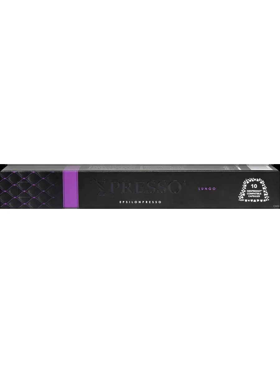 EPSILONPRESSO Lungo roasted ground coffee capsules are a balanced blend of Arabica beans for a larger brew. The flavor is delicate and velvety, with hints of fruit and nuttiness in the aftertaste. The soft, pure, and refined taste will delight true coffee connoisseurs. The capsules are suitable for use in coffee machines and espresso makers.