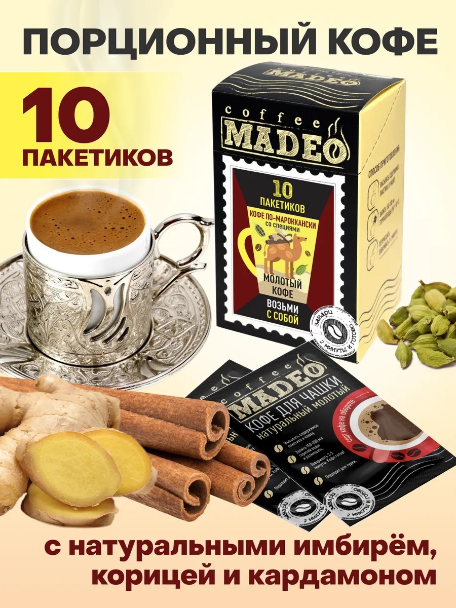 Coffee dusted with natural spices and herbs is a special type of whole-bean coffee and a unique product line on the Russian coffee market. The beans are coated with various types of savory spices, aromatic herbs, and cocoa powder. Its velvety appearance will impress aesthetes, and its 100% natural ingredients will be another reason to choose this coffee for anyone who adheres to a healthy lifestyle. We recommend adding milk to this coffee, as the spices contain fat-soluble antioxidants that are beneficial for the body! Moroccan Ground Coffee is a spicy oriental coffee with the addition of natural ginger, cardamom, and cinnamon. This ground coffee will warm you up, invigorate you, and lift your spirits. Morocco is famous for its amazing spiced coffee. Each cafe has its own coffee recipe, but the basics are the same everywhere: it must be brewed (in a Turk or geyser coffee maker), made from strong varieties, and always spiced. Moroccan coffee is flavored with pepper, cardamom, ginger, cloves, cinnamon, and even sesame seeds, depending on the owner's preference. Due to its high-altitude origins, Arabica beans are rich in vitamins, antioxidants, and minerals. A serving of ground coffee is specifically designed for a 120-150 ml cup. For the perfect taste, simply pour hot water over the coffee, cover the cup, and let it steep for about three minutes. The grounds will settle to the bottom, and the drink will be delicious and rich. If you're making coffee in a Turkish coffee pot, add 2 teaspoons of coffee and 120-150 ml of water. Place over low heat and remove from the heat, just before the foam begins to rise, without bringing it to a boil. Pour the coffee into a cup and add cream and sugar to taste, if desired. The display case contains 10 individual coffee bags. Convenient to take with you to the office, on a trip, or on a business trip. Madeo / Madeo