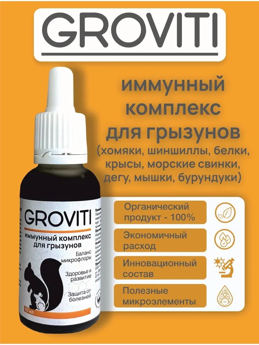 Биокомплекс Groviti для укрепление иммунитета хомяков, мышей, крыс, морских свинок, белок, шиншилл, бурундуков, дегу, кроликов, с целью развития и роста, нормализации ЖКТ, снижения негативных воздействий окружающей среды и последствий несбалансированного питания, а также для профилактики и защиты от различных заболеваний и инфекций. Снижает интоксикацию организма животного. Улучшает зрение, состояние кожи и шерсти. Улучшает пищеварение, устраняет дизбактериоз, снижает тревожность, оказывает антитоксические воздействия, увеличивает продуктивность и получение здорового потомства. Легко применять, достаточно смешать с водой или другой жидкостью для питья, всего 1 мл (10-12 капель) 1-2 раза в сутки, применять рекомендуем на постоянной основе, но не менее 30 дней. Совместим с другими кормовыми добавками и лекарственными средствами для животных. Безопасен для окружающей среды, человека и животных.