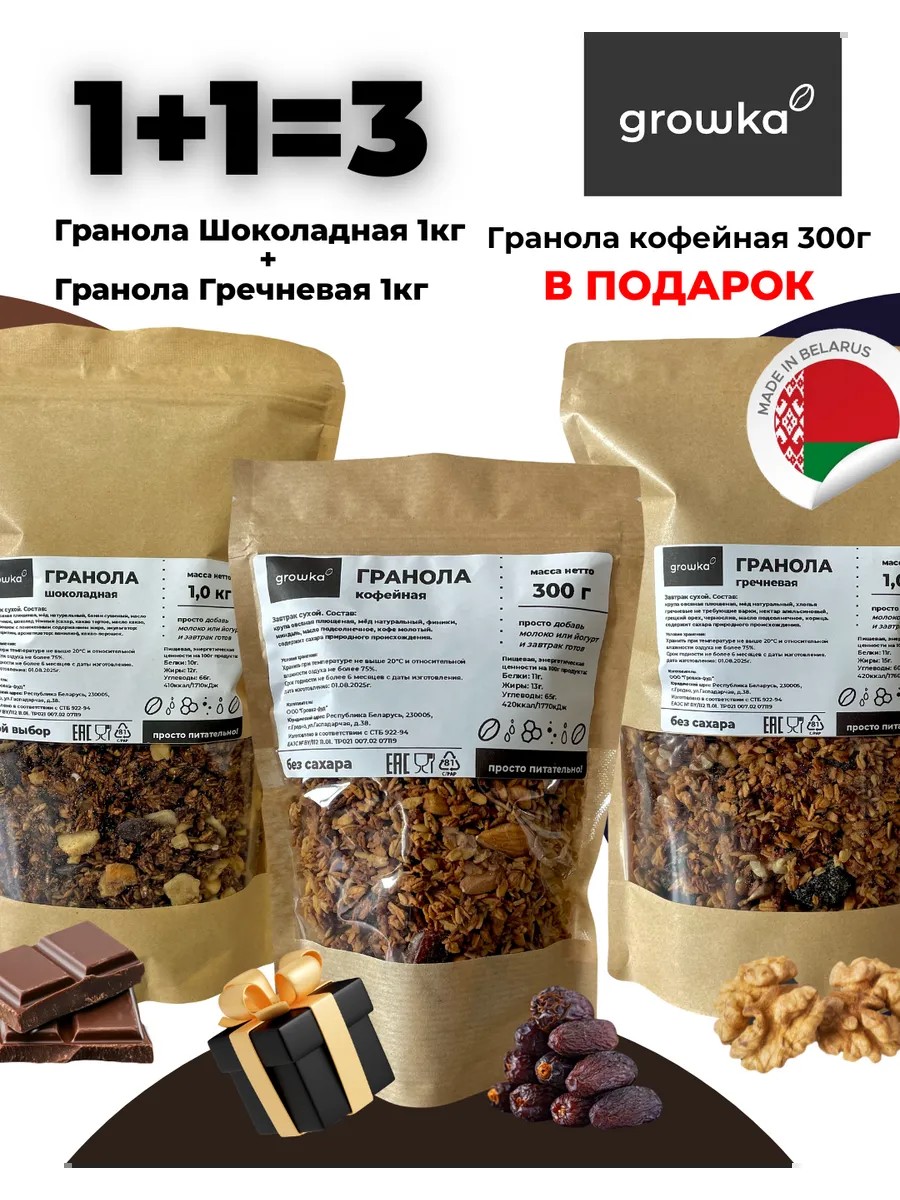 | Комплектация | гранола шоколадная 1 кг; Гранола гречневая 1 кг; гранола кофейная 300г |