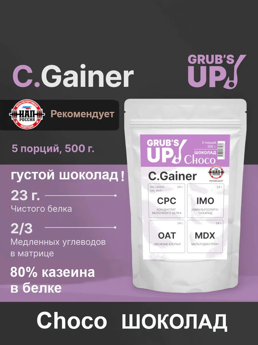 Вкусный шоколадный десерт, который содержит все полезные нутриенты классического Grub's up! C.Gainer - 23гр белка на порцию и 2/3 медленных углеводов в матрице.
