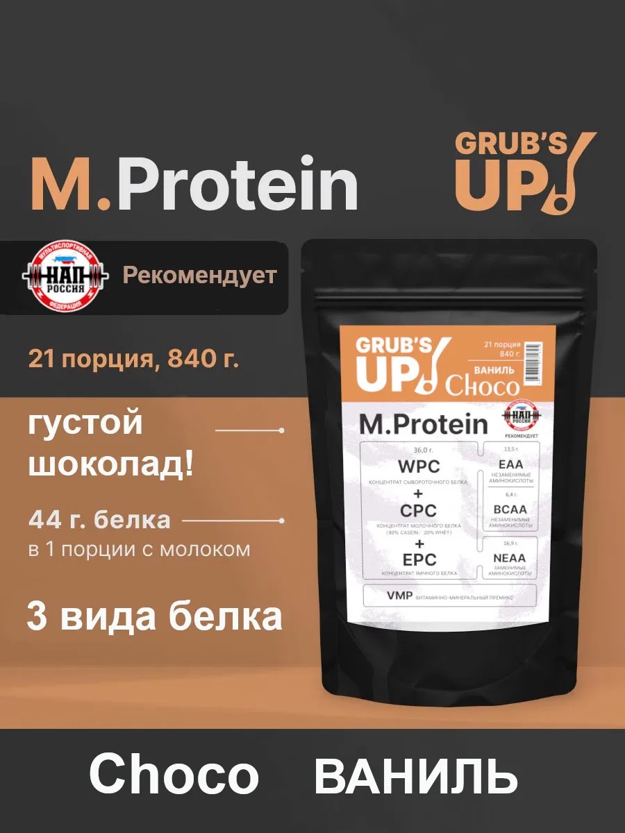 Вкусный легкий шоколадный десерт, который содержит все полезные нутриенты классического Grub's up! M.Protein - 30гр белка на порцию, в том числе 6,4гр ВСАА. Не содержит веществ, запрещенных BADA.