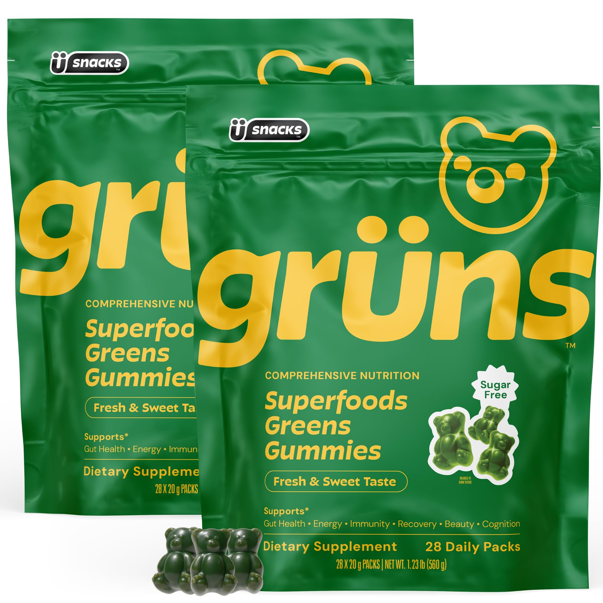 Formulated to Fit Your Life: At Grüns, we believe that foundational nutrition should be simple and convenient for everyone. We're dedicated to bringing comprehensive and complete nutrition to you through our gummies, formulated from 60 nutrient-dense and whole-food ingredients. No Cutting Corners: Grüns is plant-based and vegan. Our gummies are free from gluten, dairy, and nuts with no artificial additives. Available in low-sugar and sugar-free options. Every pack is made with the finest whole-food ingredients and produced using the highest quality manufacturing practices. Advancing with Science: The ingredients in Grüns have been studied for hundreds of years and are backed by 35,000 research publications. Our dedication to innovation along with groundbreaking research is what ensures we're making the most comprehensive gummy. It's a delicious habit backed by science that you'll want to keep. No Mess, No Stress: Grüns is thoughtfully formulated to be a delicious and seamless addition to your daily routine with our convenient individual snack packs. Each pack contains 8 tasty gummy bears so there's no more cobbling together handfuls of supplements. Enjoy the delightful flavor and benefits of our comprehensive nutrition gummies anytime, anywhere. 2 x 28 packs, 224 gummies in sugar free, and 228 gummies in low sugar. A Gummy that Fills the Gaps: Grüns Super Greens Gummy Bears are a carefully formulated methylated multivitamin with 60 potent ingredients such as whole fruits, veggies, super mushrooms, prebiotics, adaptogens, and more to offer effective nutrition in one product. The ingredients in this fresh, light Strawberry Sweet Green flavored gummy can help improve your gut health, support immunity, and strengthen mental focus.