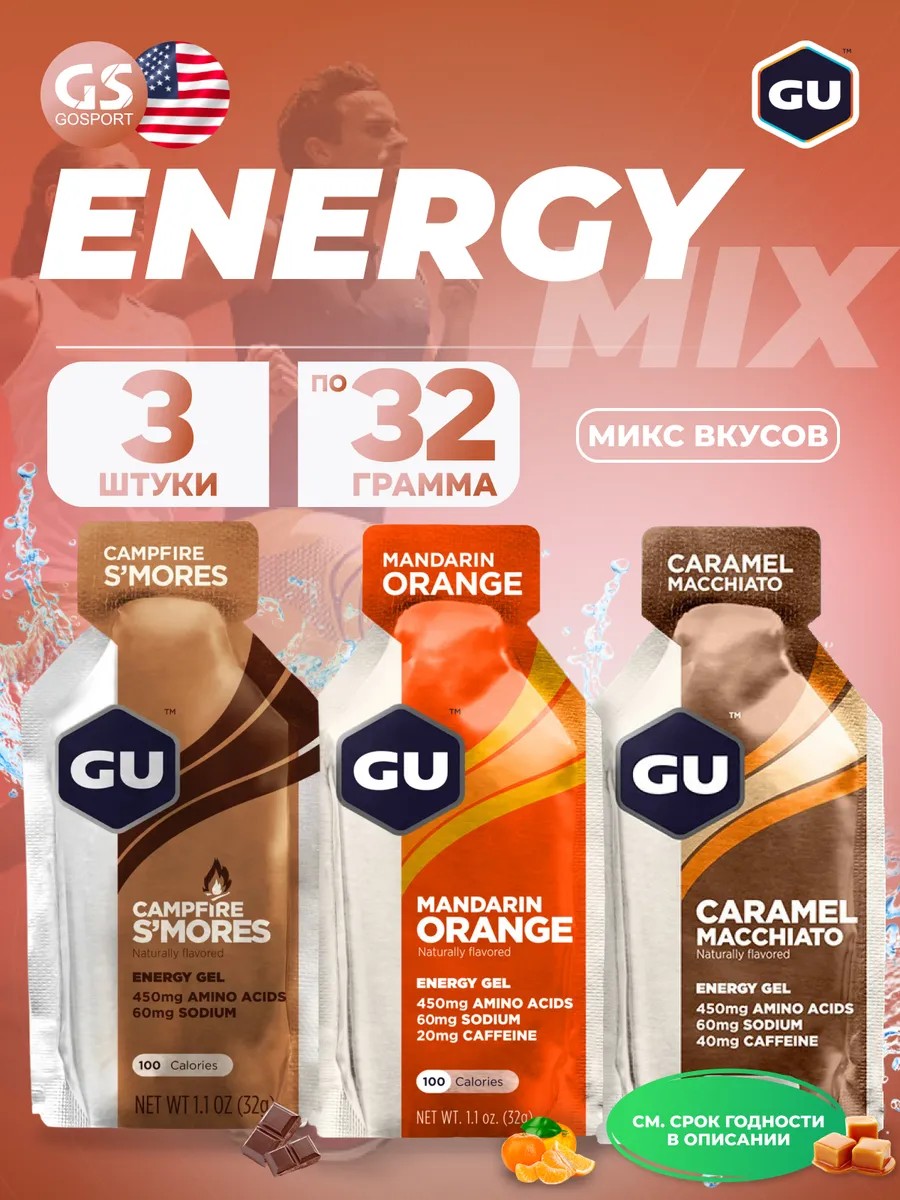 Годен до 30.05.2026. Энергетический гель питьевой Gel MIX 3 x 32 г, Микс. Высококалорийный - 100 калорий в порции - энергетический гель для ежедневных тренировок и соревнований. Содержит первичный электролит натрий, восстанавливающий солевой баланс. Содержит аминокислоты - 450 мг в каждой порции. GU Energy Gel создан для ежедневных тренировок и соревнований. Самый энергоемкий гель на рынке – содержит 100 ккал на 32 гр. 100 калорий содержат 2 углевода (мальтодекстрин и фруктозу), которые усваиваются в организме разными путями, поэтому дают максимальное количество энергии на протяжении 45 минут и не нагружают ваш желудок. Содержит натрий, основной электролит, теряемый с потом, способствует гидрации и поддерживает водно-солевой баланс в организме. Аминокислоты с разветвленной цепью (лейцин, валин, изолейцин) уменьшают усталость и защищают мышцы от повреждений. Веганский продукт. Не содержит глютена. Энергетический гель GU помогает поддерживать уровень энергии при продолжительной физической нагрузке. Пакет содержит 100 калорий, а углеводы (мальтодекстрин и фруктоза) используют не конкурирующие пути, чтобы помочь в обеспечении максимального углеводного поглощения и усваивания, одновременно не допуская проблем с желудком.