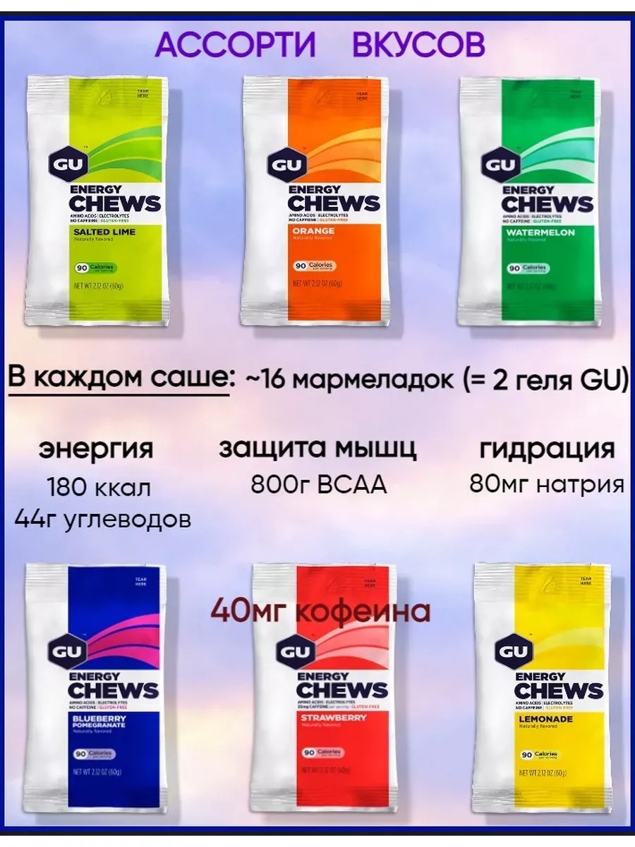 Желейные энергетические конфеты GU Energy CHEWS (произведено в США), ассорти вкусов с BCAA и электролитами, а так же 1 с кофеином - это интересная, вкусная, эффективная и очень удобная в хранении и дозировке альтернатива энергетическим гелям для бега и других циклических видов спорта на выносливость.