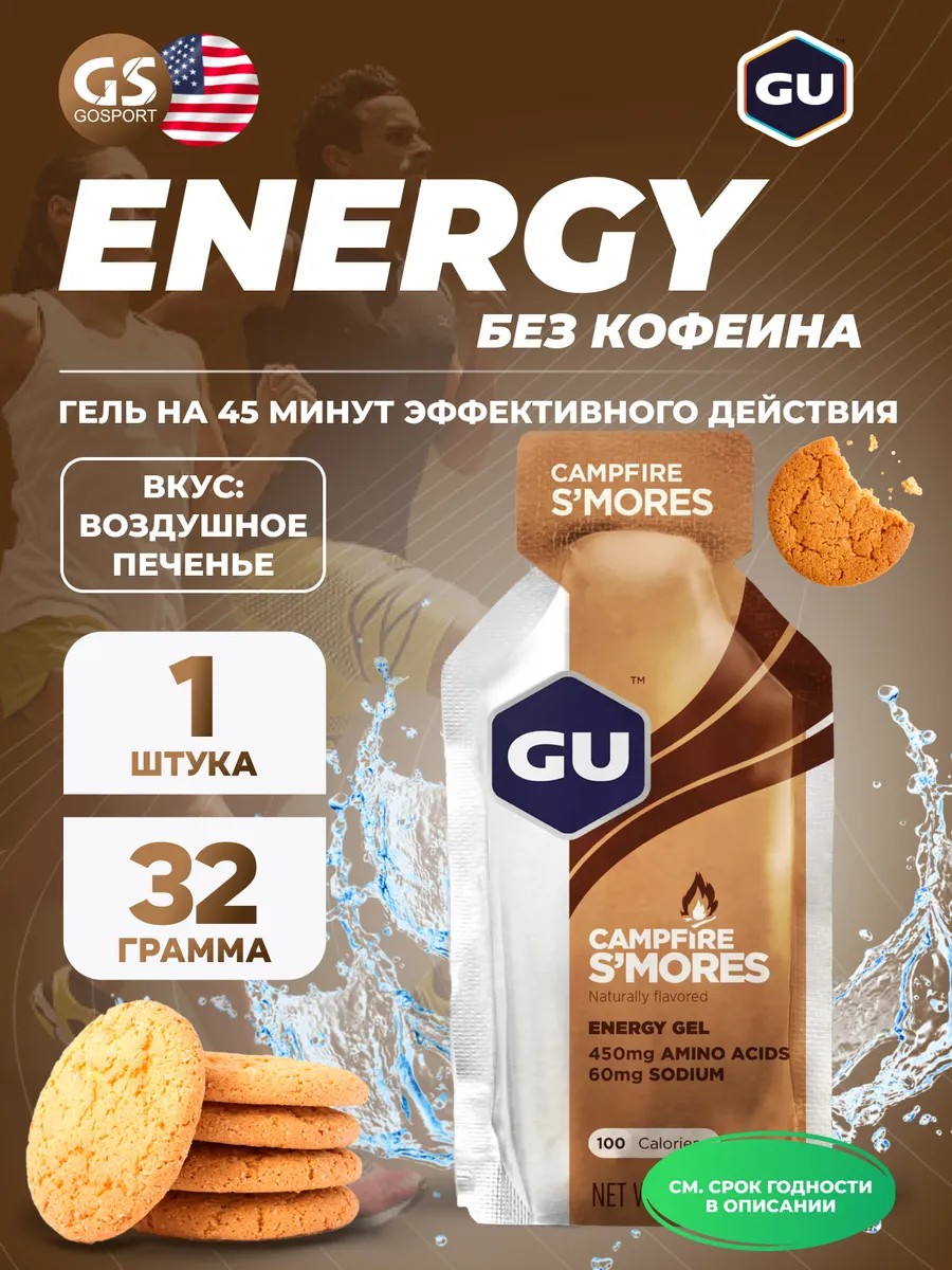 Годен до 31.05.2026. Энергетический гель GU Original Energy Gel no caffeine 32 г, Воздушное печенье. GU Energy gel no caffeine - энергетический гель содержит углеводы для получения энергии, электролиты для гидратации и BCAA для защиты работающих в мышц. Высококалорийный - 100 калорий в порции - спортивный гель для ежедневных тренировок и соревнований. Быстродействующие и долговременные углеводы - из мальтодекстрина и фруктозы, которые усваиваются в организме разными путями, поэтому дают максимальное количество энергии на протяжении 45 минут и не нагружают ваш желудок. Энергетические гели содержат натрий, основной электролит, теряемый с потом, способствует гидрации и поддерживает водно-солевой баланс в организме. Углеводный гель GU Energy gel no caffeine содержит аминокислоты - 450 мг в каждой порции. Аминокислоты с разветвленной цепью (лейцин, валин, изолейцин) уменьшают усталость и защищают мышцы от повреждений. Кому подходит гель? Бег, велосипед, плавание и другие циклические виды спорта. Игровые виды спорта. Боевые виды спорта и кроссфит. Энергетический гель для бега Energy gel может стать полезным компонентом профессионального спортивного питания для спортсменов и людей, занимающихся спортом или фитнесом. Продукт подходит для мужчин и женщин, заботящихся о своем здоровье и красоте. Рекомендации по приему: 1 порция за 5 мин до тренировки и далее каждые 45мин. Обязательно пейте больше жидкости во время приёма гелей, чтобы помочь организму эффективно переработать топливо.