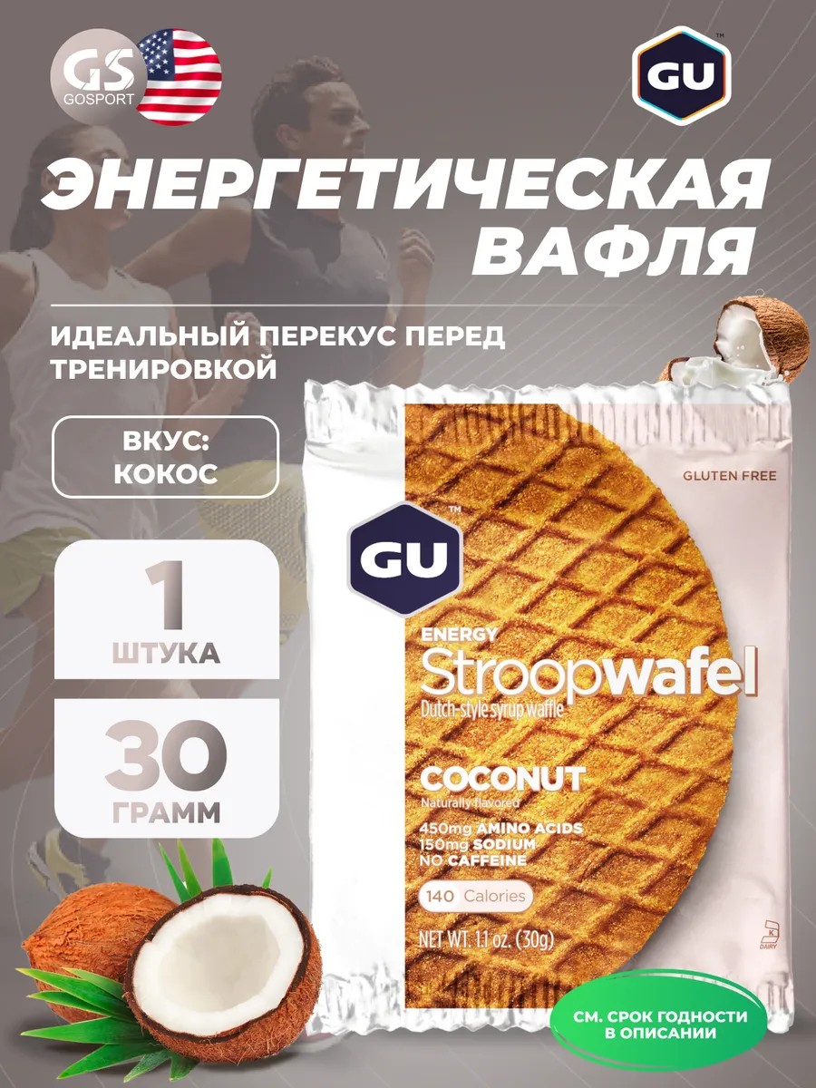 Годен до 08.11.2025. Энергетический батончик GU ENERGY STROOPWAFEL no caffeine 32 г, Кокос. Уникальный энергетический десерт – мягкие вафли с сиропом между слоями Содержат все необходимые питательные вещества и комплекс углеводов Содержат электролиты и аминокислоты Каждая вафля имеет индивидуальную упаковку – удобно взять с собой Каждая вафля содержит — 140 ккал, 450 мг аминокислот, 75 мг натрия*, до 20 мг кофеинаПодробности и состав вафель Созданные для ежедневного использования, до и во время тренировок и соревнований, мягкие вафли GU ENERGY STROOPWAFEL содержат все питательные вещества, необходимые для высокой производительности: комплекс простых и сложных углеводов (для немедленной и длительной энергии), незаменимые аминокислоты (для предотвращения умственной усталости и восстановления поврежденых мышц во время длительных мероприятий), а также электролиты (для восполнения того, что теряется с потом). Вафли имеют слой вкусного сиропа между двумя тонкими пластинками и индивидуально упакованы, чтобы их было легко взять на поездку или забег.Кому подходят вафли? Бег, велосипед, плавание и другие циклические виды спорта. Игровые виды спорта. Боевые виды спорта и кроссфит.