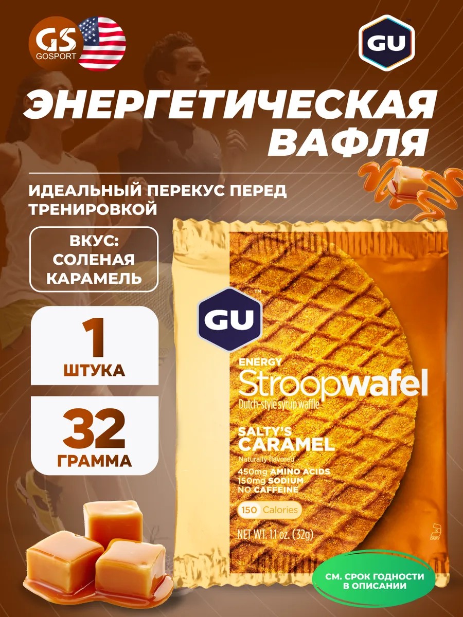 Годен до 19.03.2026. Энергетический батончик GU ENERGY STROOPWAFEL no caffeine 32 г, Соленая карамель. Уникальный энергетический десерт – мягкие вафли с сиропом между слоями Содержат все необходимые питательные вещества и комплекс углеводов Содержат электролиты и аминокислоты Каждая вафля имеет индивидуальную упаковку – удобно взять с собой Каждая вафля содержит — 140 ккал, 450 мг аминокислот, 75 мг натрия*, до 20 мг кофеинаПодробности и состав вафель Созданные для ежедневного использования, до и во время тренировок и соревнований, мягкие вафли GU ENERGY STROOPWAFEL содержат все питательные вещества, необходимые для высокой производительности: комплекс простых и сложных углеводов (для немедленной и длительной энергии), незаменимые аминокислоты (для предотвращения умственной усталости и восстановления поврежденых мышц во время длительных мероприятий), а также электролиты (для восполнения того, что теряется с потом). Вафли имеют слой вкусного сиропа между двумя тонкими пластинками и индивидуально упакованы, чтобы их было легко взять на поездку или забег.Кому подходят вафли? Бег, велосипед, плавание и другие циклические виды спорта. Игровые виды спорта. Боевые виды спорта и кроссфит.