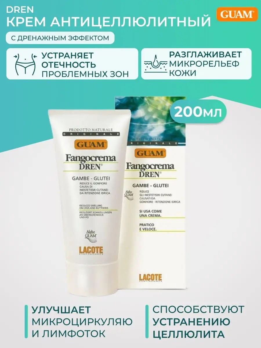 Устраняет отечность проблемных зон (особенно ноги и ягодицы), идеально подходит для закрепления процедуры дренажного антицеллюлитного обертывания. Основные компоненты крема обладают липолитической активностью, улучшают микроциркуляю и лимфоток, разглаживают микрорельеф кожи, способствуют устранению целлюлита. Для достижения максимального результата рекомендуется наносить Крем не только утром / днем, но и на ночь, так как именно в ночное время особо активно работает дренажная функция кожи, действие которой направлено на выведение избыточной жидкости из организма и снижение зашлакованности на клеточном уровне.Способствует снятию отёчности, эффективно продлевает. Прекрасно подходит для закрепления процедуры обёртывания. Способ применения: наносить на кожу мягкими движениями перед сном.Для достижения наилучших результатов используется в комплексе с дренажным обертыванием.КАК ИСПОЛЬЗОВАТЬ:Ноги больше других частей тела постоянно ощущают неудобства, вызванные физическими нагрузками, избыточным весом, несоответствующей обувью и длительным пребыванием на ногах в течение рабочего дня. Активные ингредиенты крема активизируют обменные процессы, улучшают микроциркуляцию в тканях и лимфатический отток, что способствует снятию отёчности, усталости и тяжести в ногах. Может использоваться для профилактики и лечения отёчных форм целлюлита. Для достижения наилучших результатов используется в комплексе с дренажным обёртыванием. Активные компоненты: экстракт водорослей GUAM, кофеин, карнитин, экстракт плюща, экстракт иглицы шиповитой, эсцин.