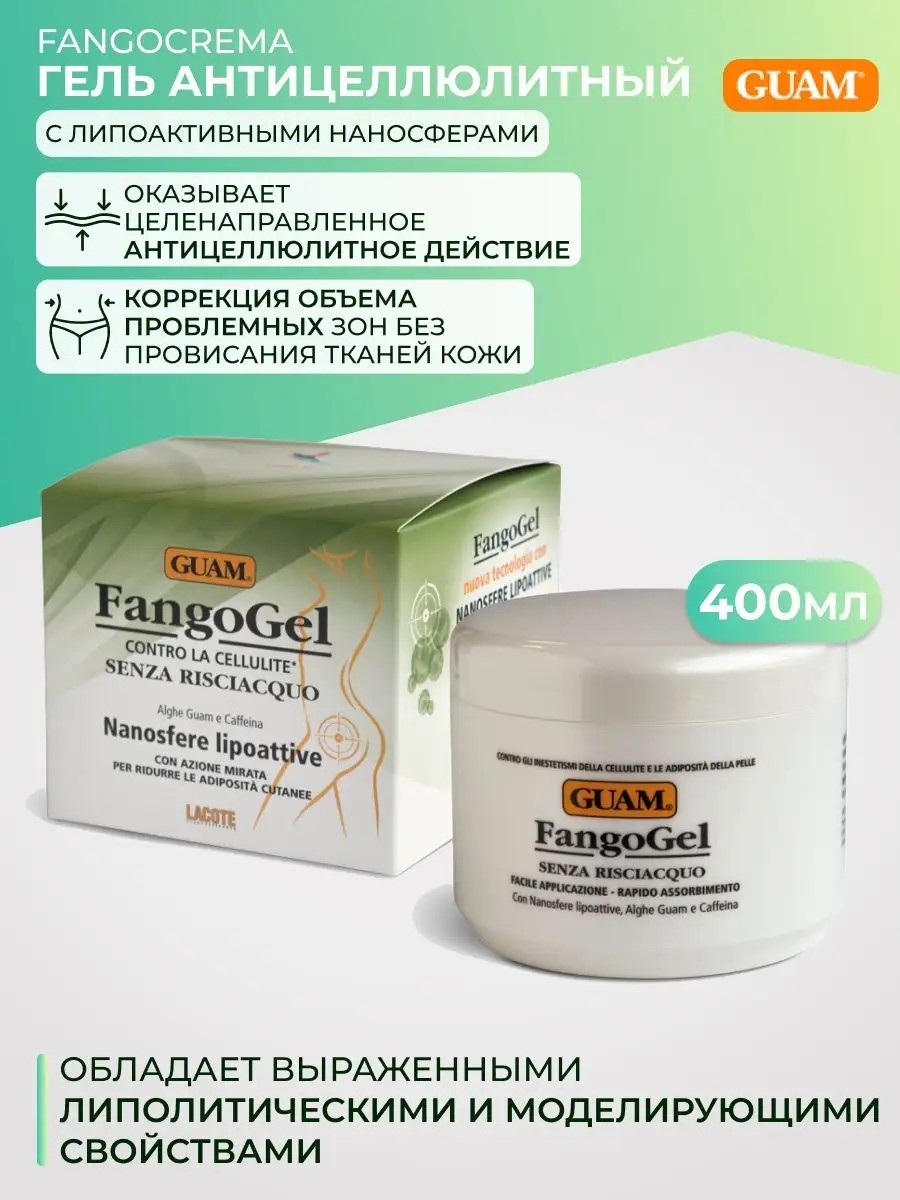 An intelligent, next-generation neurocosmetic product is an optimal alternative to wrapping, requiring no rinsing or film. It has a jelly-like texture and is white with a slight menthol tint. This product, with pronounced lipolytic and anti-cellulite activity, has a targeted action against cellulite; it has pronounced lipolytic and sculpting properties; and significantly improves skin elasticity. Its innovative formula is based on the direct, targeted action of its active lipolytic components, which are delivered directly to adipocytes (fat cells) using the patented "LIPOACTIVE NANOSPHERES" transport system. The lipoactive nanospheres contained in the gel effectively suppress subcutaneous fat cells, inhibiting their reproduction and activating lipolysis, which together ensures a slimmer silhouette. The gel is quickly absorbed, has a pleasantly light texture, and requires no rinsing. Result: Visibly pronounced lipolytic and anti-cellulite effects, a slimmer silhouette, and smooth, even, healthy skin. Contraindications: Individual intolerance to any of the ingredients. Directions for use and dosage: Apply a sufficient amount of GUAM FANGOGEL to problem areas (thighs, buttocks, abdomen, waist, and upper arms) using circular motions once a day for 15-20 consecutive days. A maintenance course is then recommended: once a day, 2-3 applications per week for 2-3 months. The product may generate heat, the intensity of which depends on the skin's sensitivity. Composition: Aqua water, shea butter ethyl esters, propylheptyl caprylate, isoamyl laurate, butyrospermum parkii butter butyrospermum parkii (shea butter), unsaponifiables, hydroxyethyl acrylate/sodium acryldimethyltaurate copolymer, siloxanetriol alginate, glycerin, squalane, pentylene glycol, butylene glycol, menthyl nicotinate, parfum fragrance, isoamyl cocoate,