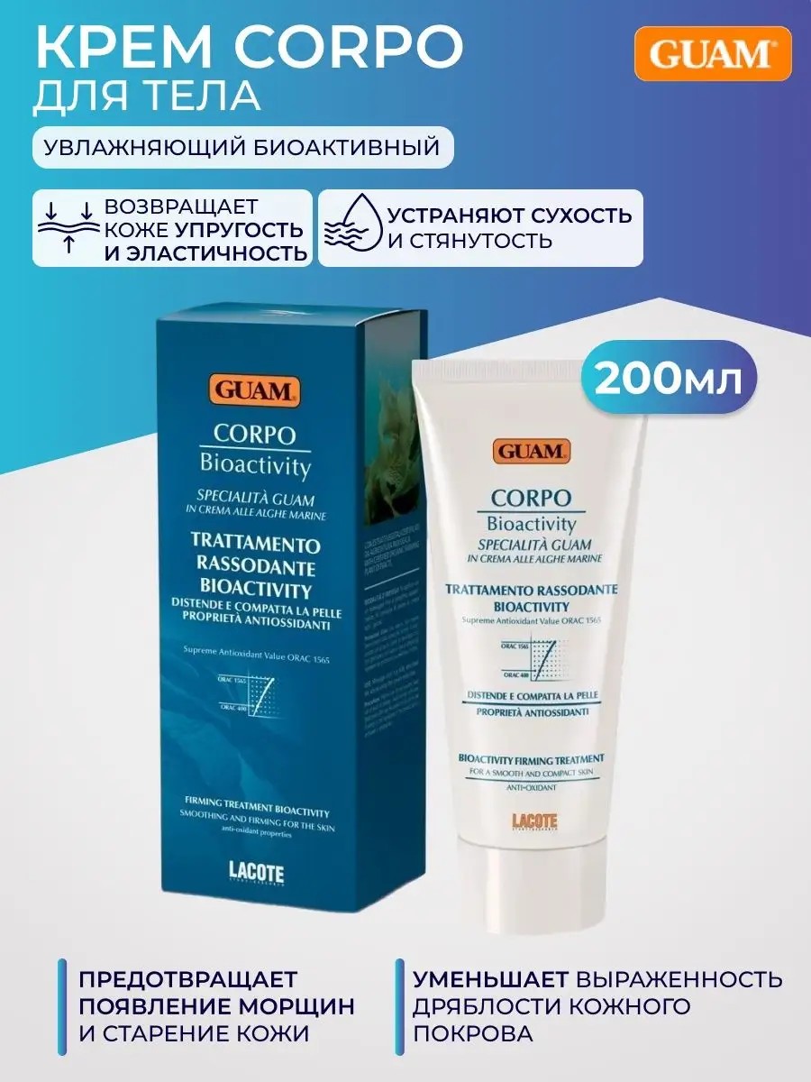 КРЕМ УВЛАЖНЯЮЩИЙ БИОАКТИВНЫЙ ДЛЯ ТЕЛА 200 МЛ / GUAMАктивные комплексы крема подобраны таким образом, чтобы максимально обогатить препарат питательными, увлажняющими и омолаживающими свойствами. Они восстанавливает структуру кожи, возвращая ей природную гладкость, упругость и эластичность, предотвращают обезвоживание, замедляют клеточное старение и увядание, устраняют сухость и стянутость.Возвращает коже упругость и эластичность. Действие активных компонентов крема направлено на максимальное питание и увлажнение кожи. Предотвращает появление морщин и старение кожи, уменьшает выраженность дряблости кожного покрова.Состав крема обогащен инновационной формулой BIOACTIVITYтм (ORAC 1565), которая позволяет в несколько раз увеличить антиоксидантное действие на кожу и эффективно защищает клетки от повреждения свободными радикалами. Применение: наносить 1-2 раза в день утром и/или вечером на все тело массажными движениями до полного впитывания.Активные компоненты: экстракт водорослей GUAM (ламинария), увлажняющий комплекс: экстракт красных водорослей KAPPAPHYCUS ALVAREZII (каппафикус алвареззи), морская вода, глицерин; органические масла авокадо, семян пенника лугового, карите, лецитин/фосфатидилхолин, гидролизированный белок пшеницы, гидролизированные гликозаминогликаны.