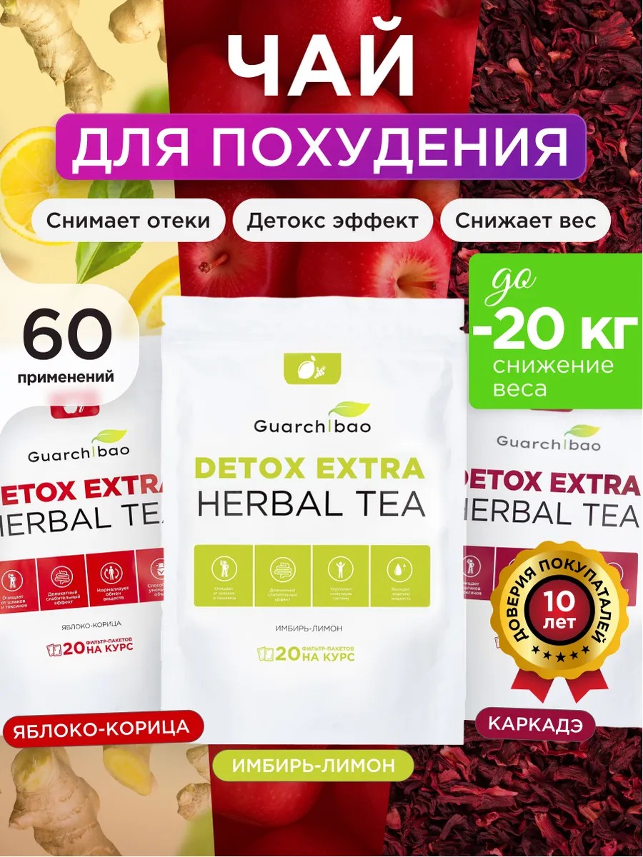 Детокс чай GUARCHIBAO - предназначен для похудения, очищения и ускорения обмена веществ. Он эффективно очищает организм от шлаков и токсинов, а также имеет мягкое слабительное действие. Detox чай очищающий кишечник от шлаков, а также полезен для укрепления здоровья. Состав натуральный и включает в себя семена расторопши, которые улучшают регенерацию клеток печени и защищают от токсинов, александрийский лист, тысячелистник, кусочки фруктов и специи (корица, лемонграсс, имбирь). Это помогает ускорить обмен веществ, укрепить здоровье и иммунитет. Использование: нужно заварить один фильтр-пакетик в горячей воде и настоять 3-5 минут. Жидкая форма моментально всасывается, усиливает лимфоток, оказывает дренажный и легкий мочегонный эффект.По действию похожий на лимфомиозот от отеков. Поэтому, в первую очередь, это отличная детокс формула, ускоряет обмен веществ, увеличивает дневной расход калорий и подавляет аппетит. Его химическая формула оптимально сбалансирована для устранения избыточных отложений жира, обвислости кожи и целлюлита. Мочегонный чай обладает эффективным действием. Чай имеет состав полезных витаминов и антиоксидантов, которые подарят вашему организму приятную поддержку в процессе ухода за кожей и укрепления иммунитета. Он заряжает энергией, тонизируют и улучшают самочувствие. Это - отличное решение для тех, кто ищет не только средство для снижения веса, но и решение проблем со здоровьем и детокса организма.