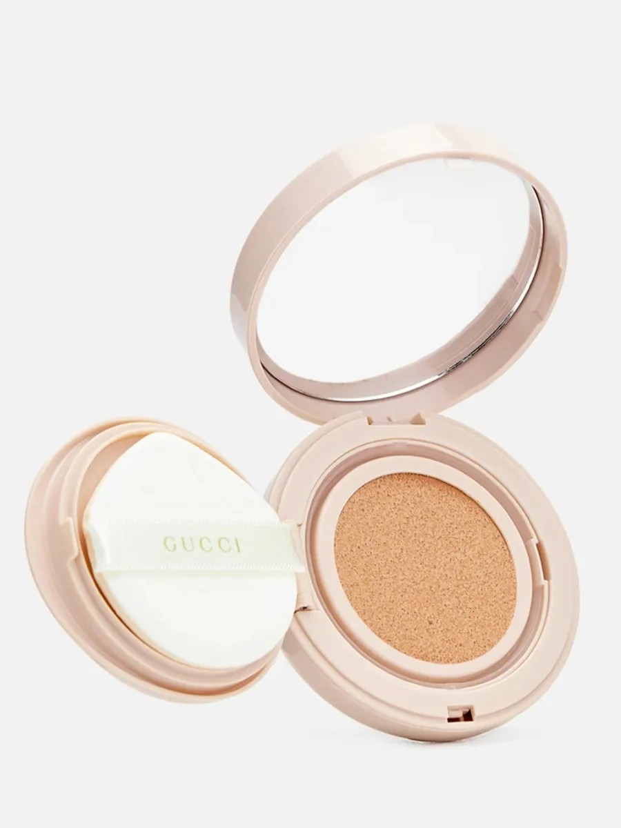 The new Gucci Beauty Cushion De Beaute foundation: a lightweight, comfortable formula that perfectly tones skin, provides up to 24 hours of hydration, and offers SPF protection.