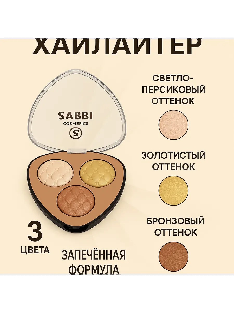 Запечённый хайлайтер универсальная палетка из трёх оттенков (перламутровый, золотистый, розово-бронзовый), которая идеально подойдёт для создания сияющего макияжа. Лёгкая текстура плавно ложится на кожу, не осыпается и подчёркивает естественную красоту. Подходит для лица, зоны декольте и тела.