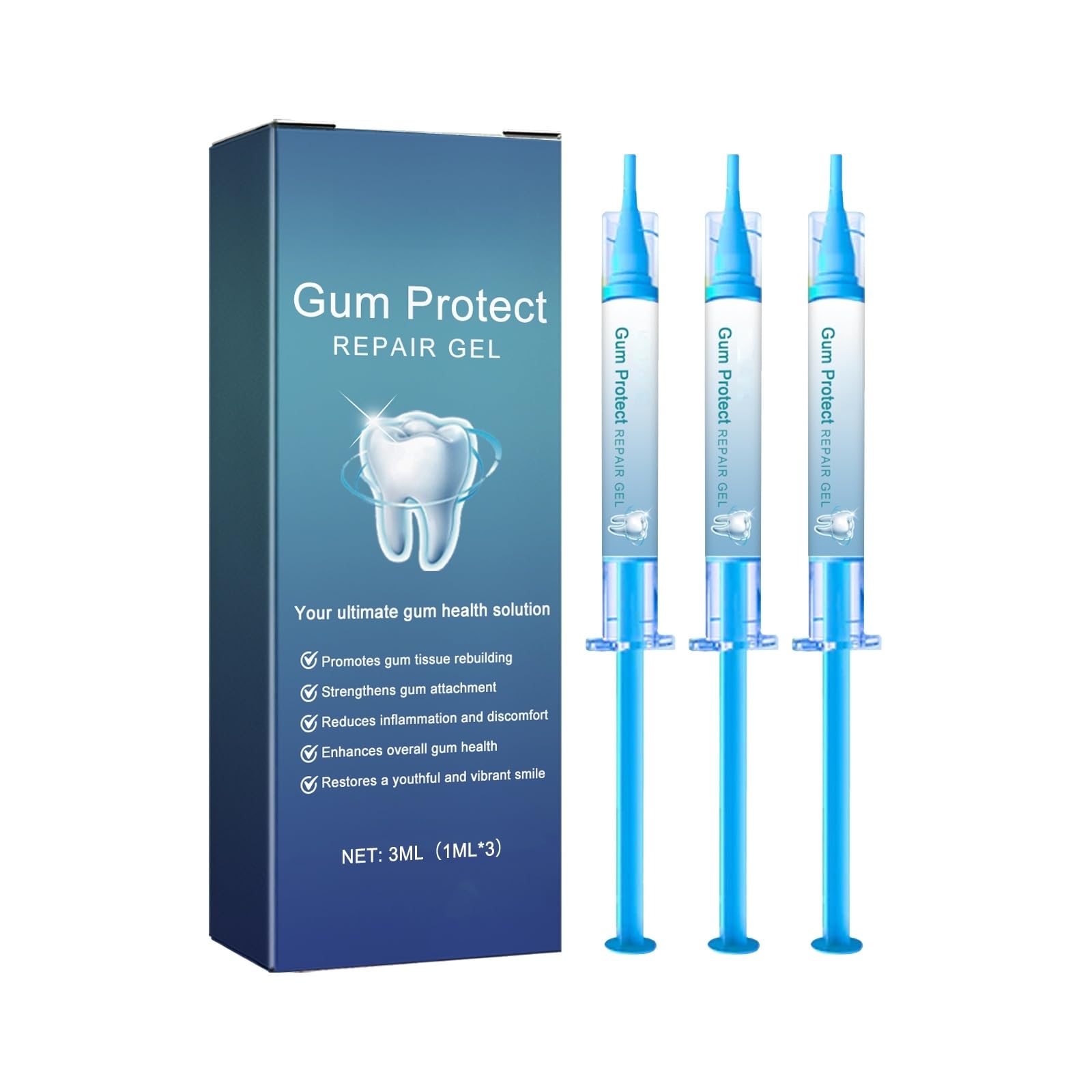 EASY TO USE: Simply apply the gel to gums as directed for effective repair and protection, helping maintain healthy gums and supporting long-term oral health. CONVENIENT SYRINGE APPLICATION: Comes in a pack of 3 easy-to-use 1mL syringes (3mL total) with precision applicator tips for targeted application directly to affected gum areas. REDUCES INFLAMMATION AND DISCOMFORT: Specially designed to reduce gum inflammation and discomfort while enhancing overall gum health for improved oral wellness. MULTI-BENEFIT FORMULA: Targets inflammation and infection of the gums, helps prevent gradual loss of gum tissue, addresses exposed tooth roots, and stops gum tissue from pulling away from teeth. COMPREHENSIVE GUM HEALTH SOLUTION: Gum Protect Repair Gel is specifically formulated to promote gum tissue rebuilding, strengthen gum attachment, and restore a youthful and vibrant smile.