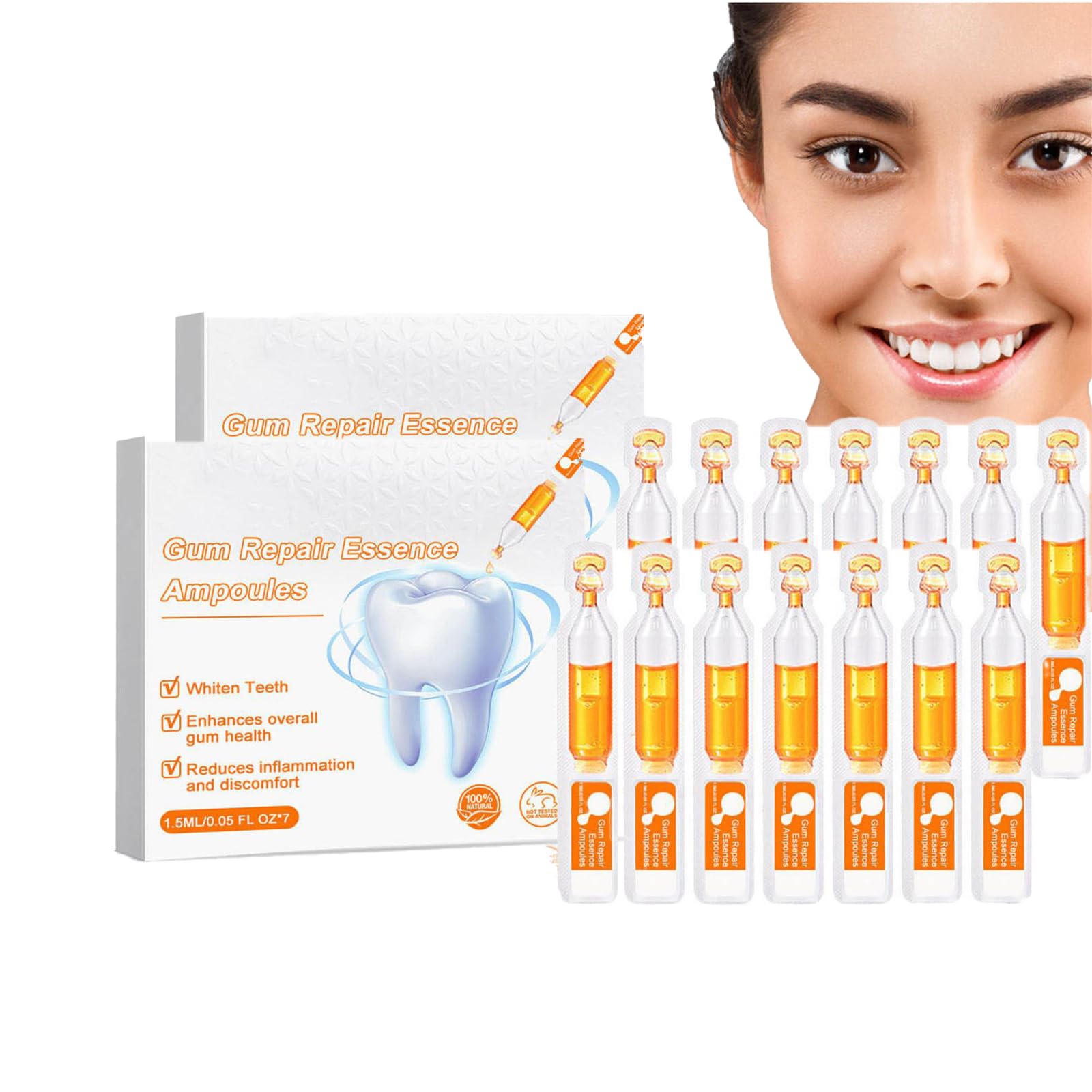 Name: gum repair essence ampoules Applicable amount: all Most important ingredients: Hyaluronic acid, aloe vera extract, vitamin C, soda, chamomile extract Advantages of the product: White teeth Improves the general health of the gums Reduces inflammation and discomfort Application: Clean your mouth before going to bed; Take an ampoule essence; Apply a thin layer to the gum area; Wait about 1 minute to spit out the essence and rinse your mouth. Packing list: 1/2/3 PC * Gum Repair Essence Ampoules (7 pieces) ?Easy application? Apply it evenly to your teeth and target areas with tartar deposits that are difficult to remove.It can be applied directly to your toothbrush for brushing your teeth or applied to toothpaste to use it with every toothpaste.?Fresh breath? toothpaste can help you eliminate bad breath, alleviate dentin hypersensitivity and repair damaged and dilapidated gums with menthol to keep your breath fresh.?Gum care? Oral smell, relieves tooth sensitivity, bleeding gums, etc. Solve tooth sensitivity and bleeding gums, repair damage and back gums.?Gentle and safe ingredients? Gum repair essence ampoules contains a variety of herbal extracts, minerals, vitamins and organic compounds that help to resolve hardened tartar so that it can be removed and infections can be avoided.?GUM repair essence ampoules? Our gum repair essence can lighten yellow teeth thoroughly, remove tartar, dissolve the plaque and bring a comprehensive and clean oral experience.Eliminates bad breath, relieves tooth sensitivity, bleeding gums, etc. Name: Zahnfleisch-Reparatur-Essenz Ampullen Anwendbare Menge: Alle Wichtigste Inhaltsstoffe: Hyaluronsäure, Aloe Vera-Extrakt, Vitamin C, Natron, Kamillenextrakt Vorteile des Produkts: Weiße Zähne Verbessert die allgemeine Gesundheit des Zahnfleisches Reduziert Entzündungen und Unbehagen Anwendung: Reinigen Sie Ihren Mund vor dem Schlafengehen; Nehmen Sie eine Ampulle Essenz; Tragen Sie eine dünne Schicht auf den Zahnfleischbereich auf; Warten Sie etwa 1 Minute, um die Essenz auszuspucken und den Mund zu spülen. Packungsliste: 1/2/3 PC * Gum Repair Essence Ampoules (7 Stück enthalten)?Einfache Anwendung?Tragen Sie es gleichmäßig auf Ihre Zähne auf und zielen Sie leicht auf schwer zu entfernende Bereiche mit Zahnsteinablagerungen ab. Es kann zum Zähneputzen direkt auf Ihre Zahnbürste aufgetragen oder auf Zahnpasta aufgetragen werden, um es mit jeder Zahnpasta zu verwenden. ?Frischer Atem?Zahnaufhellende Zahnpasta kann Ihnen helfen, Mundgeruch zu beseitigen, Dentinüberempfindlichkeit zu lindern und beschädigtes und verfallenes Zahnfleisch mit Menthol zu reparieren, um Ihren Atem frisch zu halten. ?Zahnfleischpflege?Mundgeruch, lindert Zahnempfindlichkeit, Zahnfleischbluten, etc. Lösen Sie Zahnempfindlichkeit und Zahnfleischbluten, reparieren Sie Schäden und zurückgehendes Zahnfleisch. ?Sanfte und sichere Inhaltsstoffe?Gum Repair Essence Ampullen enthält eine Vielzahl von Kräuterextrakten, Mineralien, Vitaminen und organischen Verbindungen, die helfen, gehärteten Zahnstein aufzulösen, so dass er entfernt werden kann und Infektionen vermieden werden können. ?Gum Repair Essence Ampoules?Unsere Gum Repair Essence kann gelbe Zähne gründlich aufhellen, Zahnstein entfernen, Plaque auflösen und eine umfassende und saubere orale Erfahrung bringen. Beseitigt schlechten Atem, lindert Zahnempfindlichkeit, Zahnfleischbluten, etc.Gum Repair Essence Ampoules, Dentizen Ampullen Zahnserum, Dentizen Ampullen Zahnpasta, Zahnfleisch Reparatur Behandlungsampullen, Zahnfleisch Repair Ampullen, Ampoule Teeth Whitening Serum (2PC)