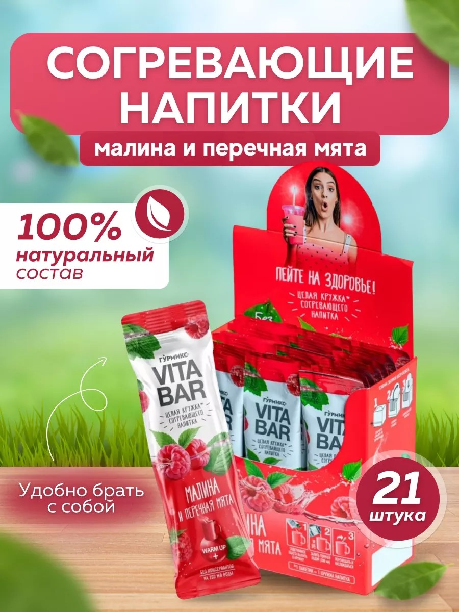 Согревающий напиток VITA BAR Гурмикс Малина и мята перечная – идеальное сочетание освежающего вкуса малины и аромата нежной мяты перечной.