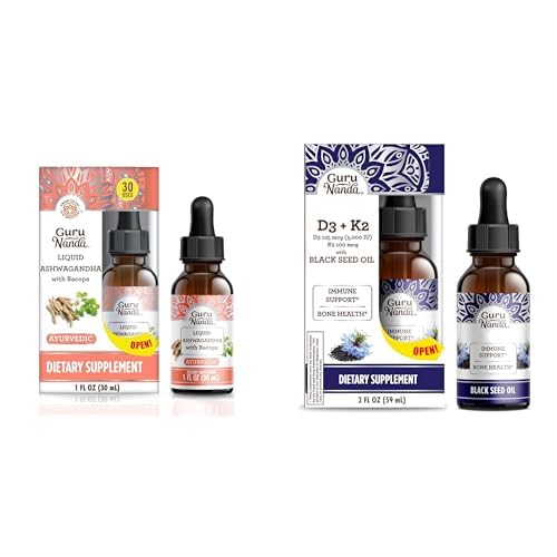Introducing the GuruNanda Wellness Bundle, featuring Liquid Ashwagandha with Bacopa (1 Fl Oz) and Black Seed Oil with Vitamin D3, K2, and E (2 Fl Oz) – a powerful combination for focus, relaxation, and immune support. The Liquid Ashwagandha, enriched with Bacopa, helps promote mental clarity, reduce stress, and support relaxation, making it ideal for enhancing focus and overall well-being. The Black Seed Oil, packed with essential vitamins D3, K2, and E, provides a potent immune boost while supporting heart and bone health. Both products are vegan, non-GMO, and made with natural ingredients to ensure maximum health benefits. This bundle offers a comprehensive approach to wellness, promoting relaxation, mental clarity, and a stronger immune system.Farm to Bottle: Every harvest is a unique batch of natural variations in taste, consistency appearance due to crop changes. We conduct rigorous testing to ensure our quality is never compromised. DIRECTIONS: Shake well before use. Take it once a day. Dilute 1 mL of the liquid with 8-12 oz. of your preferred beverage, ideally water. Stir well before taking. DO NOT USE WITHOUT DILUTING. DO NOT TAKE ON AN EMPTY STOMACH. How to Use: For adults, take one dropper full (1 ml) once or twice a day, or mix it with smoothies or juices. Drink up to 8 fl oz of lukewarm water after consumption and stay hydrated. All-Round Benefits: Harness the power of cold-pressed black seed oil supplement to boost hair skin health (patch test recommended). Embrace its antioxidants for all-around health benefits. BOOSTED IMMUNITY: Ashwagandha exhibits immune-modulating properties. Ashwagandha may help you stay healthy and resilient, reducing the risk of becoming sick during periods of vulnerability. Holistic Powerhouse: Our Black Seed Oil supplement, sourced from nigella sativa boosted with thymoquinone to promote immune support through its antioxidant properties, that aids in bone health GI well-being. STRESS REDUCTION: Ashwagandha aids the body in coping with stress by lowering cortisol levels, promoting a sense of calmness and relaxation. This natural remedy may offer relief from the pressures of daily life, supporting mental and emotional well-being.