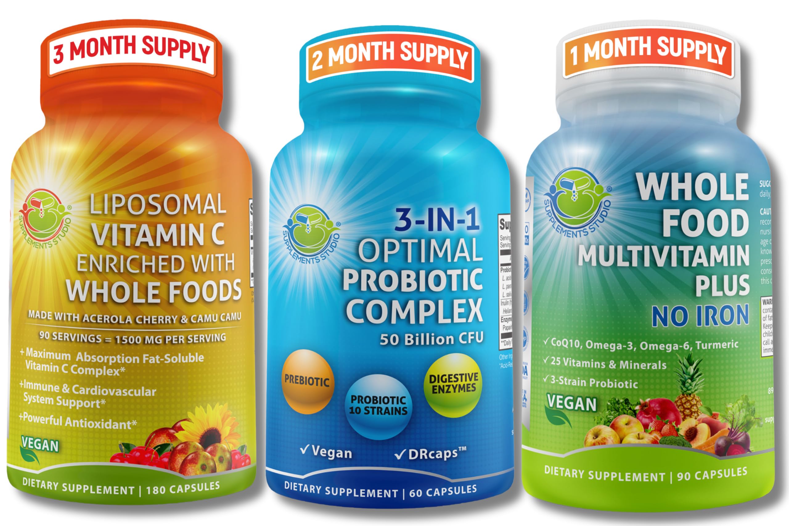 Support your digestive, immune, and whole-body health with this clean-label vegan bundle designed for daily vitality. This trio features a high-absorption Liposomal Vitamin C (1500mg) enriched with acerola cherry and camu camu, a powerful 50 Billion CFU probiotic with 10 strains plus prebiotics and digestive enzymes, and a Whole Food Multivitamin Without Iron packed with over 25 vitamins and minerals, herbal blends, and superfoods. Designed for bioavailability, gut balance, immune defense, and nutrient support, this bundle is free from fillers and artificial ingredients. It's your complete wellness solution—crafted for clean living and proudly made in the USA.Proudly Made in the U.S.: All our supplements are manufactured with rigorous quality control standards and strict adherence to current Good Manufacturing Practices (cGMP). Made with high quality natural and vegan non-GMO ingredients. Clean Non-GMO: Crafted with your health in mind, our products contain high-grade vitamins, minerals, and nutrients without the unwanted extras. Free from fillers like rice flour, magnesium stearate, and silicon dioxide, so you can trust what you're putting into your body. Formulated with integrity and transparency. Whole Food Multivitamin without Iron (1-Month Supply): This comprehensive multivitamin contains over 25 vitamins and minerals, including Vitamin A, methylated B12 Folate, D3 (from wild-harvested lichen), K2, CoQ10, Omega-3 6, Biotin, and more. Enriched with vegetables, fruit, turmeric, mushroom complex, heart support blend, enzymes, and probiotics for optimal wellness. 3-in-1 Probiotic Complex (2-Month Supply): Combines 50 billion CFUs from 10 strains of probiotics, prebiotic fiber (inulin), and digestive enzymes (bromelain, papain, amylase more) for comprehensive gut support for both women men—all in just one convenient delayed-release capsule per day. High-Absorption Liposomal Vitamin C (3-Month Supply): Delivers 1500mg of vitamin C per serving in a liposomal format for enhanced absorption and maximum effectiveness. Enriched with organic acerola cherries and organic camu camu, which are naturally rich in vitamin C, for an extra boost of nutrients.