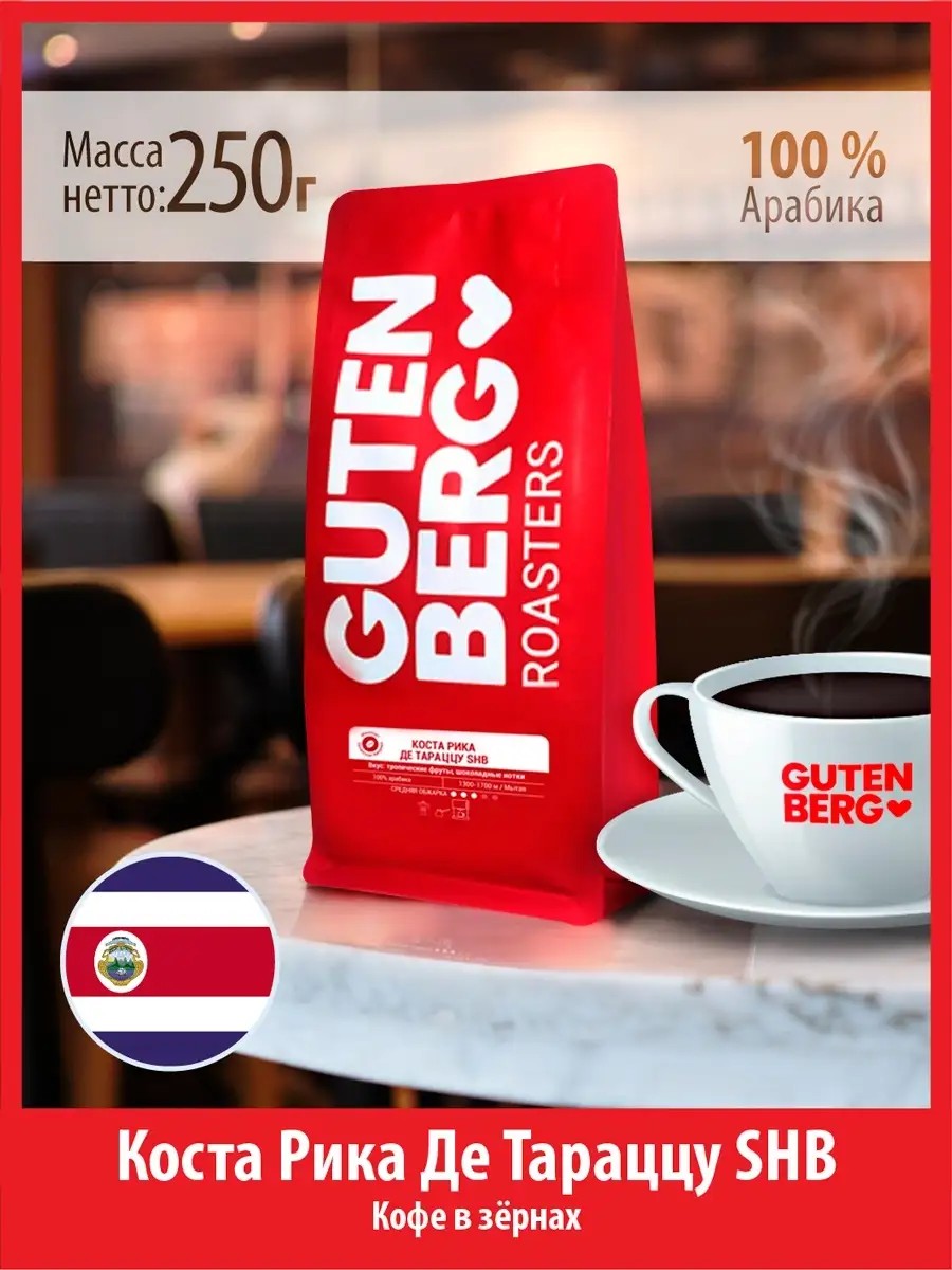 Gutenberg Кофе в зёрнах 250 г КОСТА РИКА ДЕ ТАРАЦЦУ SHB зерновой