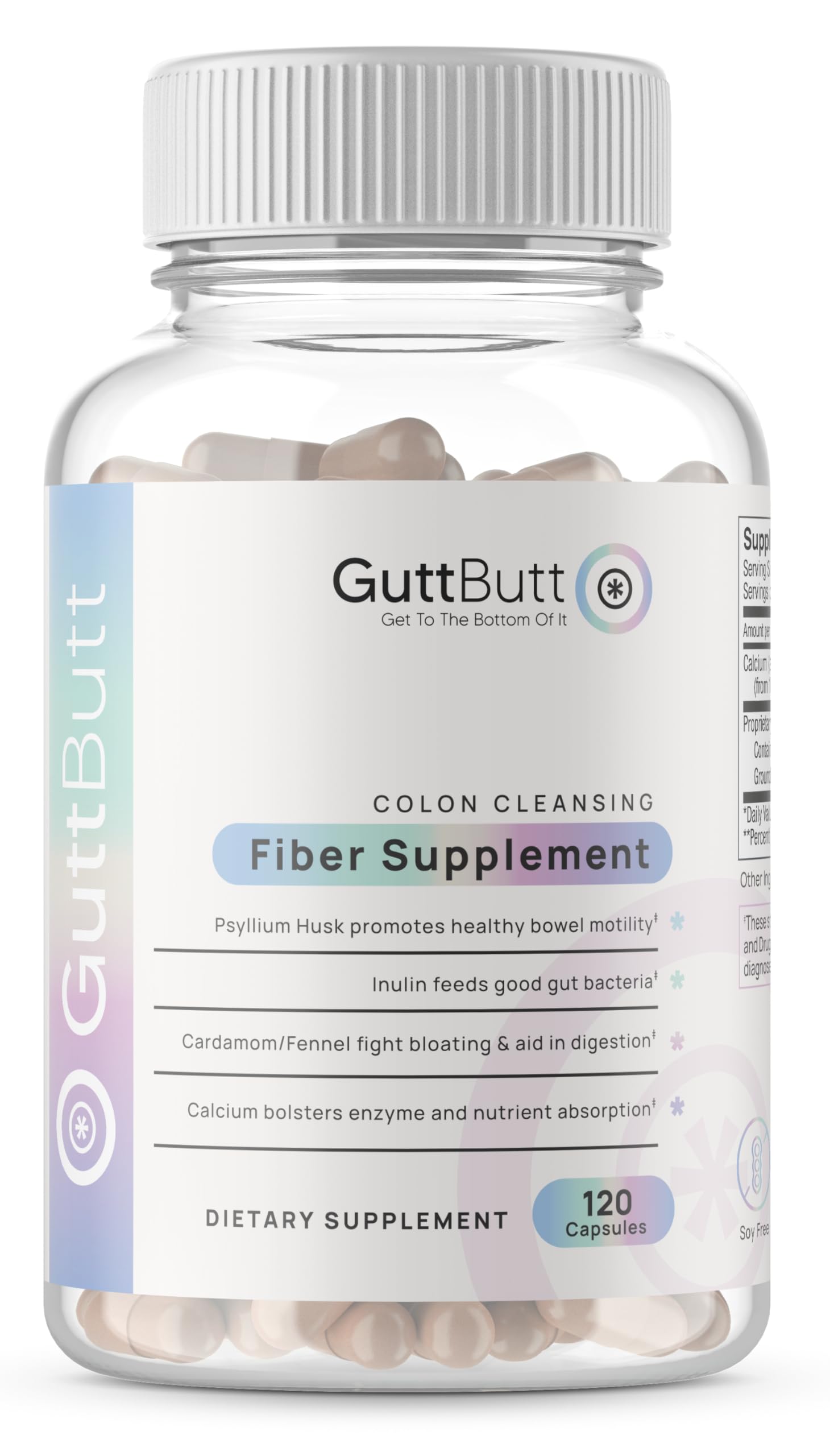 GUT HEALTH SUPPORT FOR DAILY COMFORT CONSISTENCY This plant-based fiber supplement combines soluble fiber, prebiotics, and traditional digestive herbs to help maintain gut comfort and a steady, predictable routine. Supports smoother digestion and a well-balanced digestive system. . HOW LONG DOES IT TAKE TO SEE RESULTS?: Typically, it takes 2-4 days for food to move completely through the gastrointestinal (GI) tract. So consistency is key when looking for clean exits and mess free spontaneous moments. 5 CLEAN INGREDIENTS FOR OPTIMAL DIGESTIVE HEALTH:. Cardamom has been used for centurys to combat bloating and indigestion, with compounds that ease gastrointestinal muscles. Our Calcium Carbonate ensures structured stools and enhances enzyme function for improved nutrient absorption. Inulin, with prebiotic properties, serves as a gut 'spa,' cleansing and nourishing beneficial bacteria, ensuring a smoother digestive processes. Psyllium, a soluble fiber, facilitates smooth digestion by acting as a gut traffic controller and nurturing gut bacteria. EASY 3 CAPSULES 2X DAILY ROUTINE Take 2–3 capsules with at least 16 oz of water, twice daily, 30 minutes before meals. Designed to gently expand with water to support fullness, digestive comfort, and a clean, consistent daily rhythm. . REIMAGINED CLEANLINESS SUPPLEMENT: GuttButt Fiber is the latest development in colon cleansing supplement using all natural ingredients that have worked for centurys. Our next generation fiber formula is plant based and 100 vegan with a sprinkle of calcium carbonate to help nutrient absobtion to enhance everything great about you. MULTI-FIBER BLEND FOR DIGESTIVE HEALTH REGULARITY GuttButt's purpose-built blend of psyllium husk, inulin, and plant-based fibers helps support regularity, smoother digestion, and daily gut comfort. Designed for people who want a calm, predictable digestive routine. . PURPOSE-BUILT MULTI-FIBER FORMULA GuttButt's unique blend of plant-based fibers and digestive herbs is crafted to help your gut feel calm, clean, and consistent. Our purpose-designed formula supports everyday digestive balance so you can move through your day with confidence. .