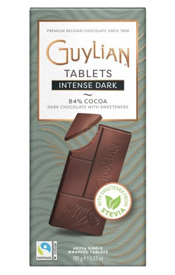 Indulge in the intense pleasure of premium Belgian dark chocolate with these superb GuyLian tablets. Each bar contains 84 cocoa, offering a rich and robust flavor profile that true dark chocolate lovers will appreciate. Naturally sweetened with stevia, these 100g tablets provide a sophisticated taste experience without traditional sugar. The elegant packaging contains four individually wrapped 25g portions, perfect for controlled enjoyment or sharing. Each tablet features GuyLian's signature embossed design and breaks easily into perfect portions. The pack contains six 100g bars (600g total), ideal for keeping your chocolate collection well-stocked. These tablets represent Belgian chocolate craftsmanship at its finest, continuing a tradition of excellence since 1958. Fairtrade certification guarantees responsible sourcing practices. Perfect for those seeking an intense dark chocolate experience with a reduced sugar content.