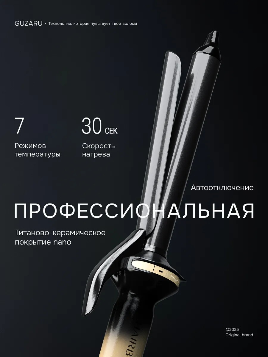 Create luxurious curls in just minutes with the professional curling iron from GuZaru! This stylish tool with a beautiful ergonomic design will become your faithful assistant in creating perfect hairstyles. Equipped with the latest technology and a ceramic coating, it ensures gentle treatment of hair, preserving its health and shine. Five temperature settings, from 40 to 180°C, a heating surface measuring 2.6 cm in diameter and 12 cm in length, allow you to find the perfect setting for any hair type. The powerful 59-watt heating element quickly heats up in just 20 seconds, and the 360-degree swivel cord ensures maximum comfort during styling. Forget about tangled cords and awkward movements! With this curling iron, you can easily and quickly create everything from casual beach waves to elegant Hollywood curls.