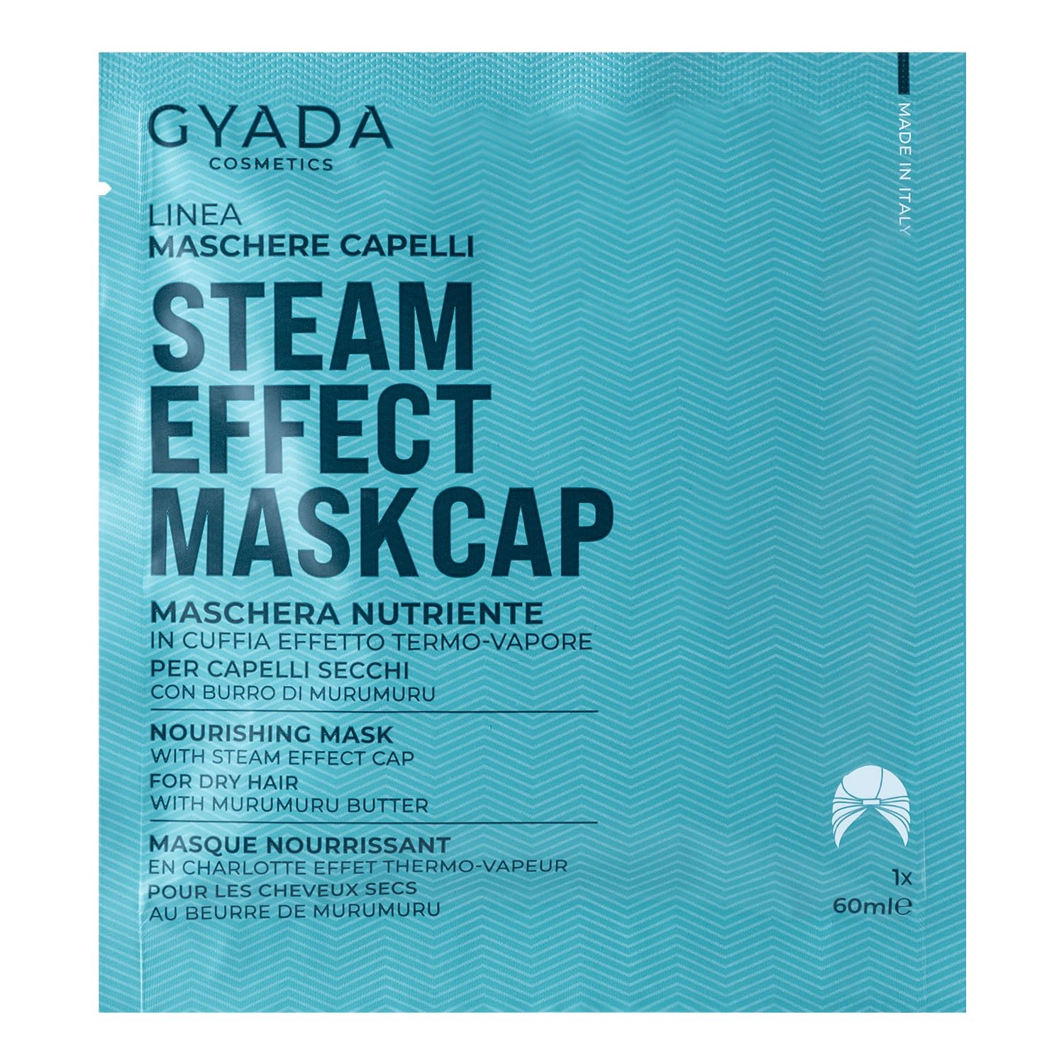 Nourishing and restructuring hair mask with a heat cap, formulated for the treatment of dry and brittle hair, with Murumuru butter and amino acids. The special heat-generating cap generates heat upon application, promoting the absorption of its active ingredients into the hair fiber. This allows you to achieve a professional treatment comfortably at home. The cap is easily washable and reusable. Contains Murumuru butter, arginine, glutamine, linseed oil, and plant extracts of guarana and mallow, perfect for improving the appearance of dry, brittle, and damaged hair. For women, men, boys, girls, and unisex use. Product approved by the Curly Girl Method. Formulated for the treatment of straight and curly hair. Formulated without alcohol, BHA, BHT, colorants, EDTA, PEG, parabens, petrolatum, SLES, SLS, silicones, or nickel. Vegan product. Instructions: Before or after shampooing, on damp, towel-dried hair, apply the cap with the closure tab facing your forehead. Remove the sticker from the tab and close it securely to improve heat distribution. Gently massage the hair to distribute the mask evenly. Leave on for at least 15 minutes. Remove the cap, rinse, and style. INGREDIENTS Aqua, Cetearyl Alcohol, Behenamidopropyl Dimethylamine, Propanediol, Lactic Acid, Glycerin, Panthenol, Parfum, Persea Gratissima Oil ( ), Cocos Nucifera Oil, Achillea Millefolium Extract, Hydrolyzed Verbascum Thapsus Flower, Juniperus Communis Fruit Extract ( ), Betaine, Tocopherol, Ascorbyl Palmitate, Lecithin, Benzyl Alcohol, Heptyl Undecylenate, Guar Hydroxypropyltrimonium Chloride, Tetrasodium Glutamate Benzoic Acid Diacetate, Dehydroacetic Acid, Citric Acid, Benzoate, Sodium Sorbate. ( ) from organic farming INSTRUCTIONS Before or after shampooing, on towel-dried hair, apply the cap with the tab facing your forehead. Remove the sticker and close tightly. Massage, leave on for 15 minutes, rinse. See moreGYADA COSMETICS: High-quality cosmetics created using exclusively natural formulations based on plant and organic extracts. Directions for use: Before or after shampooing, on towel-dried hair, apply the cap with the tab facing your forehead. Remove the sticker and close tightly. Massage in, leave on for 15 minutes, then rinse. Ingredients: Based on Murumuru butter, arginine, glutamine, linseed oil, and plant extracts of guarana and mallow. Properties: Nourishing and restructuring hair mask with a thermal cap formulated for the treatment of dry and brittle hair, with Murumuru butter and amino acids. Hair mask: Nourishing and restructuring hair mask. The cap generates heat during application, promoting the absorption of the active ingredients. The cap is washable and reusable.GYADA COSMETICS, Masque capillaire en tissu nutritif et restructurant, avec bonnet thermique, pour cheveux secs et défibrés, avec huile de lin et mauve, 60 mlDESCRIPTION DU PRODUIT DESCRIPTION DU PRODUIT Masque cheveux à action nourrissante et restructurante avec bonnet thermique formulé pour le traitement des cheveux secs et cassés, avec beurre de Murumuru et acides aminés. Le bonnet spécial à effet thermique développe de la chaleur lors de l'application du masque, favorisant l'absorption de ses actifs dans la fibre capillaire. Vous permet d'obtenir un traitement professionnel confortablement à la maison. Le bonnet est facilement lavable et réutilisable. Contient du beurre de Murumuru, de l'argine, de la glutamine, de l'huile de graines de lin et des extraits végétaux de Guarana et mauve, parfaits pour améliorer l'apparence des cheveux secs, cassés et abîmés. Pour femme, homme, garçon, fille, unisexe. Produit approuvé par Curly Girl Method. Produit formulé pour le traitement des cheveux raides, bouclés. Formulé sans alcool, BHA, BHT, Colourants, EDTA, PEG, parabènes, Petrolatum, SLES, SLS, Silicones, Nickel. Produit végétalien. Mode d'emploi : avant ou après le shampooing, sur cheveux mouillés et tamponnés, appliquez le bonnet avec la languette de fermeture tournée sur le front. Retirez l'autocollant de la languette et fermez bien en face pour améliorer le développement de la chaleur. Masser doucement les cheveux pour répartir le masque sur toute la chevelure. Laisser agir pendant au moins 15 minutes. Retirez le casque, rincez et faites le pli. INGRÉDIENTS Aqua, Cetearyl Alcohol, Behenamidopropyl dimethylamine, Propanediol, Lactic acid, Glycerin, Panthenol, Parfum, Persea gratissima oil ( ), Cocos nucifera oil, Achillea millefolium extract, Hydrolyzed verbascum thapsus flower, Juniperus communis fruit extract ( ), Betaine, Tocopherol, Ascorbyl palmitate, Lecithin, Benzyl Alcohol, Heptyl undecylenate, Guar hydroxypropyltrimonium chloride, Tetrasodium glutamate diacétate de benzoic, acide déhydroacétique, acide citrique, benzoate, sodium sorbate. ( ) issu de l'agriculture biologique issu de l'agriculture organique MODE D'EMPLOI Avant ou après le shampooing, sur cheveux tamponnés, appliquez le bonnet avec la languette vers le front. Retirez l'autocollant et fermez bien. Masser, faire agir pendant 15 minutes, rincer. Voir plusGYADA COSMETICS: Cosmétiques de haute qualité, créés par l'utilisation de formulations exclusivement naturelles, à base d'extraits végétaux et biologiques. Mode d'emploi : avant ou après le shampooing, sur cheveux tamponnés, appliquer le bonnet avec la languette vers le front. Retirez l'autocollant et fermez bien. Masser, faire agir pendant 15 minutes, rincer. Ingrédients : à base de beurre de Murumuru, arginine, glutamine, huile de graines de lin et extraits végétaux de Guarana et mauve. Propriétés : masque cheveux à action nourrissante et restructurante avec bonnet thermique formulé pour le traitement des cheveux secs et cassés, avec beurre de Murumuru et acides aminés. Masque cheveux : masque cheveux nourrissant et restructurant. Le bonnet développe de la chaleur lors de l'application, favorisant l'absorption des actifs. Le bonnet est lavable et réutilisable.