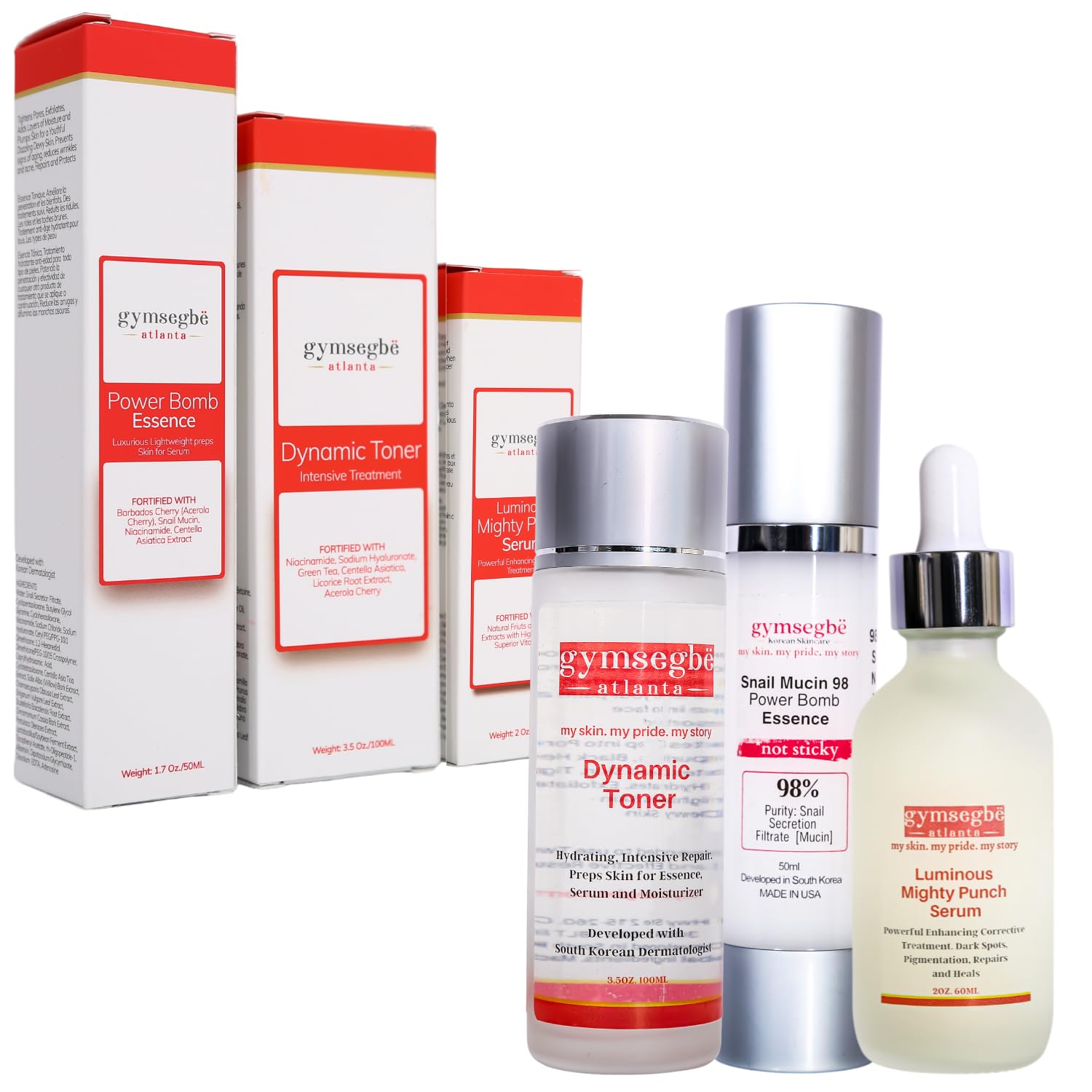 Achieve glowing, youthful skin with Gymsegbe'sUltimate 3-Step Korean Skincare Routine, featuring ourDynamic Toner, Snail Mucin 98 Power Bomb Essence,andLuminous Mighty Punch Serum. Designed to work synergistically, this regimen hydrates, brightens, and rejuvenates your skin, giving you a smooth, radiant complexion.