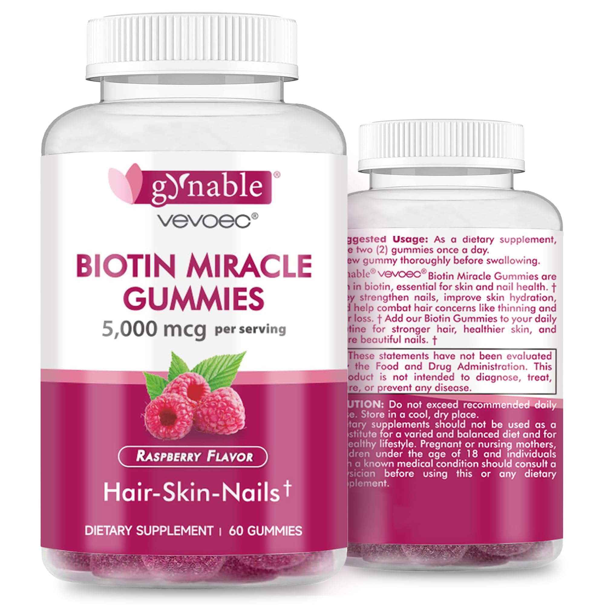 Clean Ingredients You Can Trust, USA Made Made in a GMP-certified facility in the USA, Gynable's biotin gummies for women are vegan, gelatin-free, and non-GMO. Free from gluten, soy, dairy, eggs, and artificial additives. A perfect option for anyone seeking clean, gummy vitamins for adults without compromise. Tasty, Easy Made to Fit Your Routine Say goodbye to chalky pills. These raspberry-flavored biotin gummies for hair, skin and nails make daily beauty nutrition easy. Just two hair skin nails gummies a day—no mess, no hassle. Wellness doesn't need to be complicated.Gynable- ideal hair skin nails vitamins for women and man. Hair, Skin Nails Support for Women Whether you're dealing with frequent styling, hair loss from stress, or dry, brittle nails—our hair vitamins for women are here to help. Designed for busy adults, vegans, and anyone with increased biotin needs, this formula helps you feel your best, inside and out. Smart 5000mcg Biotin Dose—Not Too Much, Not Too Little Each serving provides 5000mcg of pure biotin—just the right amount for optimal absorption and daily results. Unlike multivitamins that overload your system, our biotin supplement is clean, focused, and gentle on your body. No filler ingredients, just what your hair and nails need. Biotin for Hair Growth, Glowing Skin Stronger Nails Biotin is the beauty vitamin for a reason. Gynable Biotin Gummies for hair, skin and nails deliver targeted support for women seeking faster hair growth, stronger nails, and a youthful glow. Our formula is ideal for daily self-care and perfect for those who color, style, or chemically treat their hair regularly.